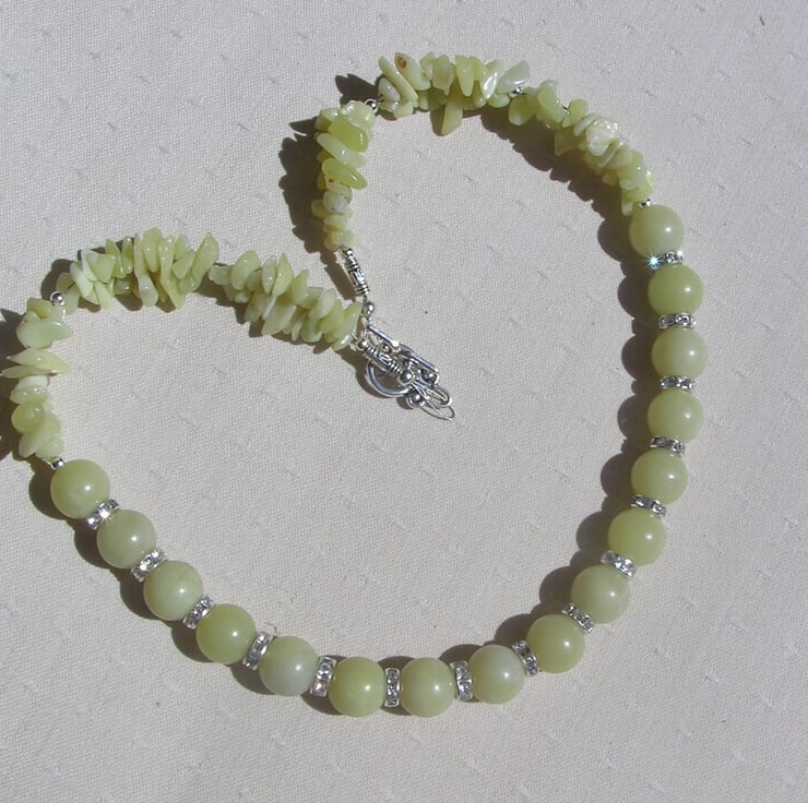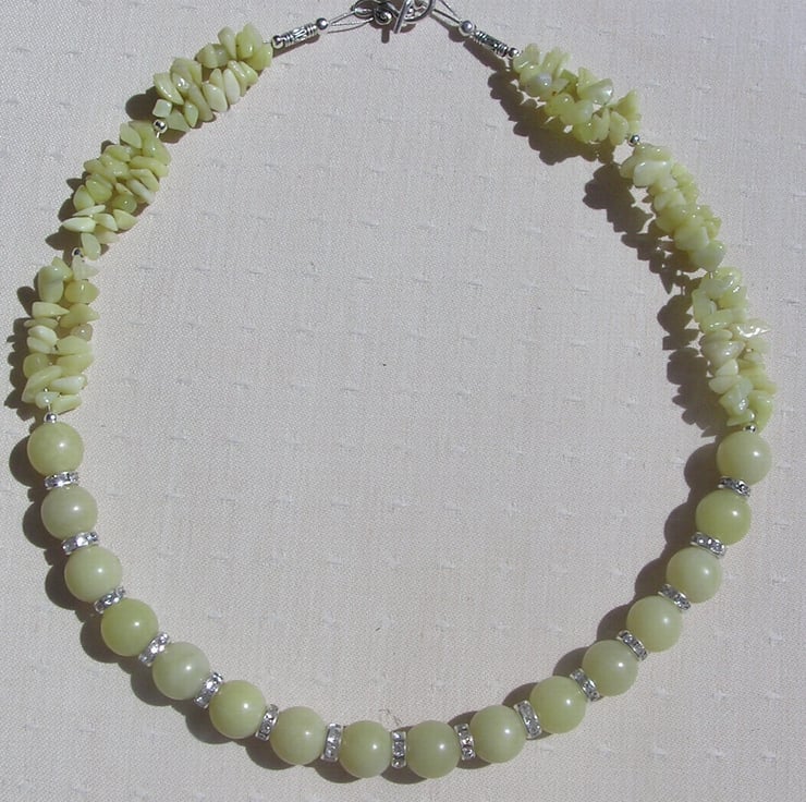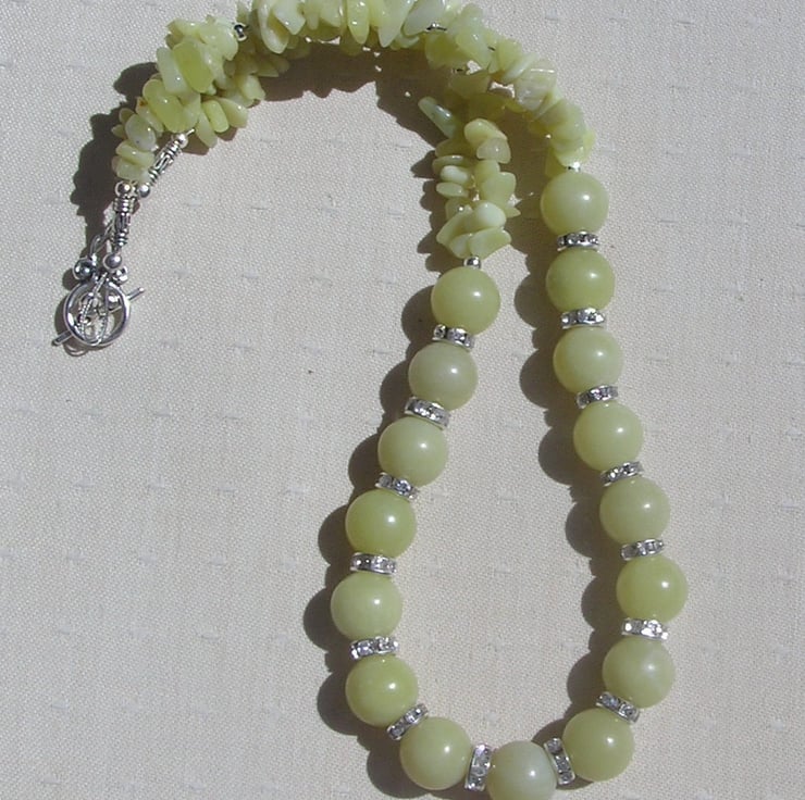 This Stunning Necklace is made from Lemon Jade Large round beads alternated with Glistening Crystal studded spacers finished by double-stranded Lemon Jade Gem-Stone Chips - a soothing Sunny effect that will look stunning either worn casually or with something more Elegant for a Special Evening out