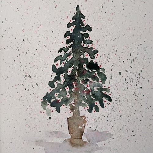 Original watercolour Christmas tree painting, mounted.