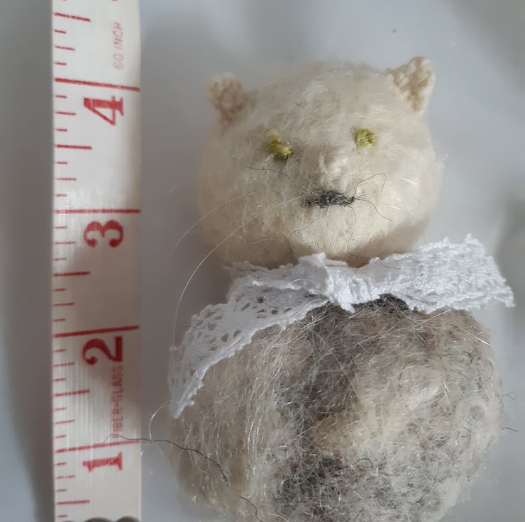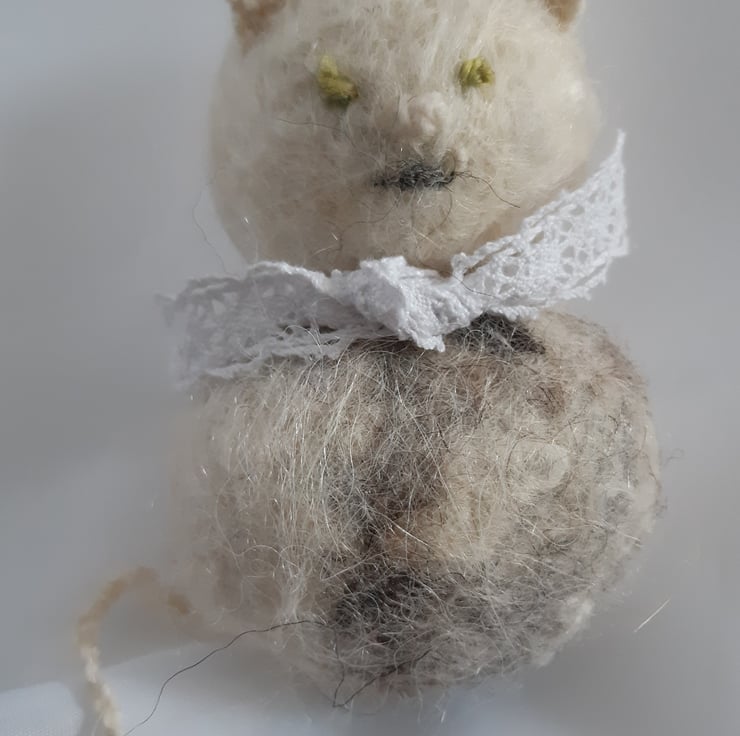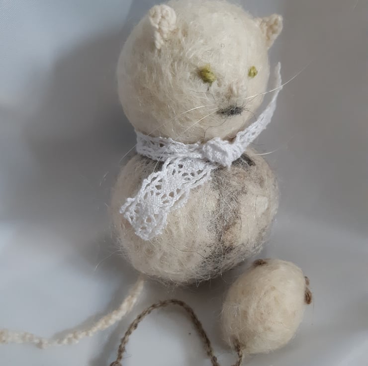 A natural wool felted mouse made from two balls stitched together. Its mouse friend was felted round a little pinecone. Stitched features, plied tails and nylon thread whiskers added after. The cat's lace collar can be removed.