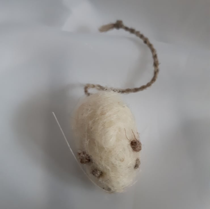 Fleece made into a ball or strands of wool fibre wrapped around a pinecone ... wet felted, dried and embellished.