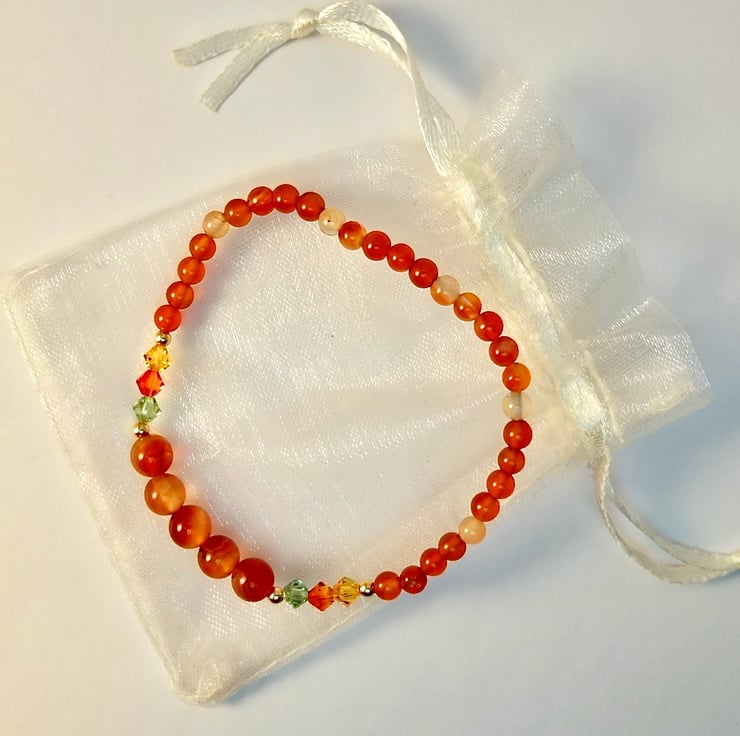 Natural Carnelian bracelet in sunset hues adorned with sparkly Swarovski crystals.