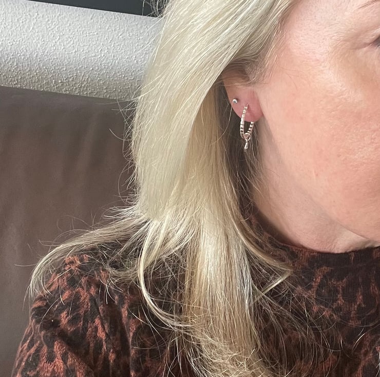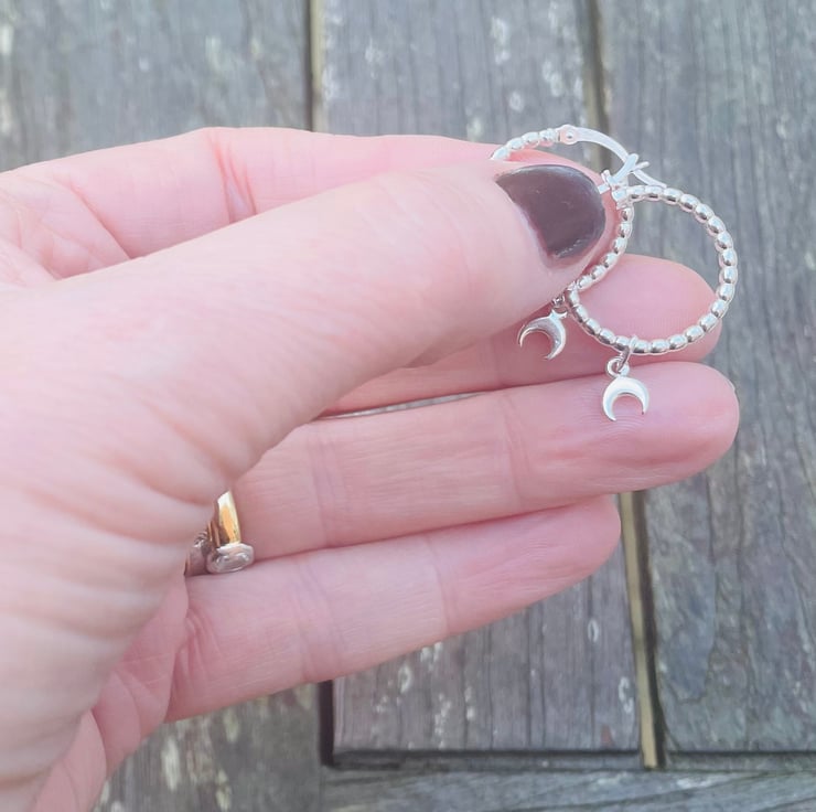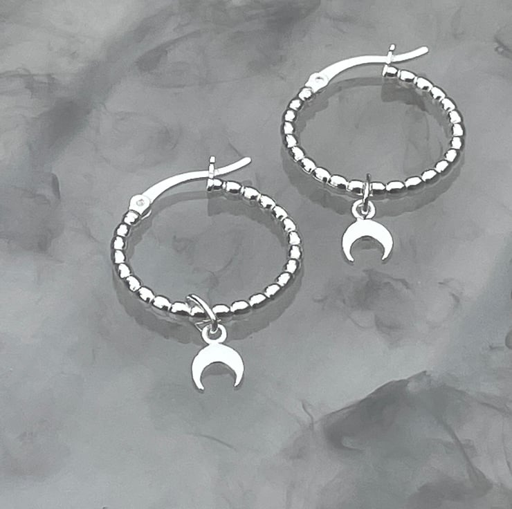 20mm bead effect Sterling Silver hoop earrings with upturned crescent moon.