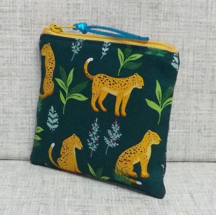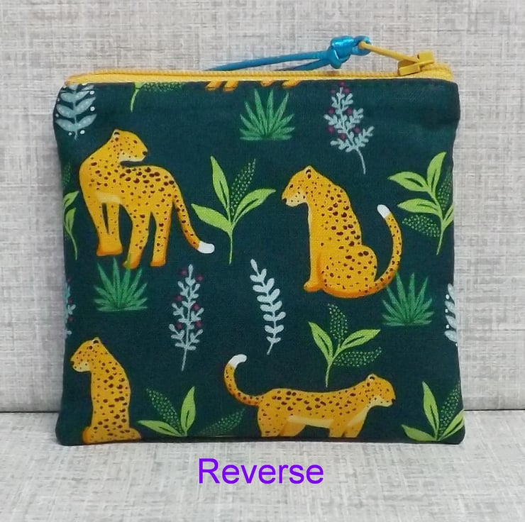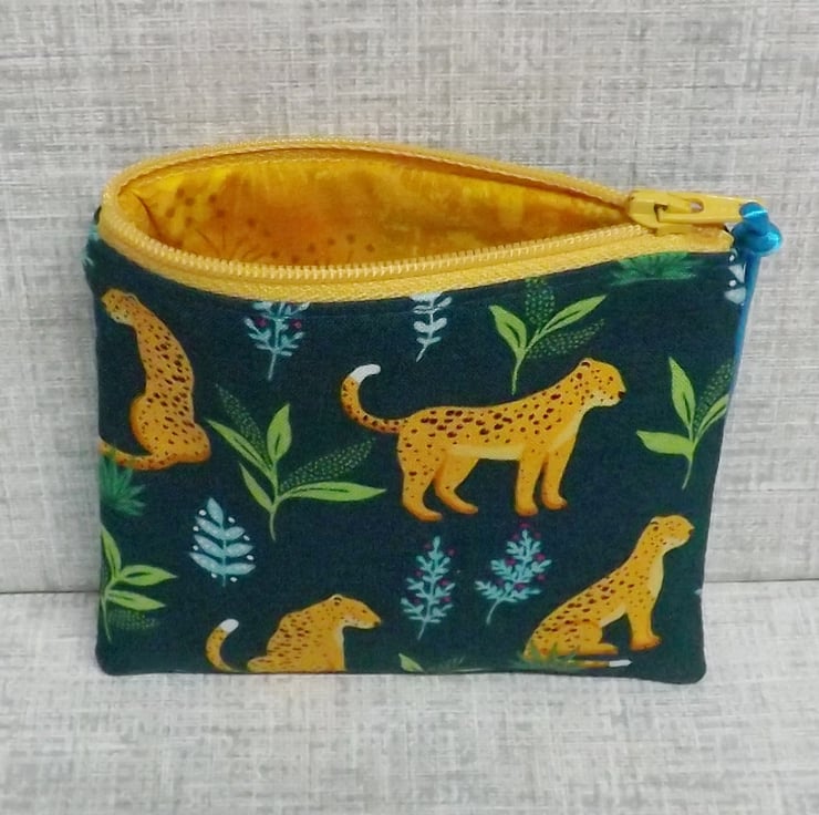 The main fabric has a design of golden yellow coloured leopards with leaves in shades of green & blue, on a dark green backround.
