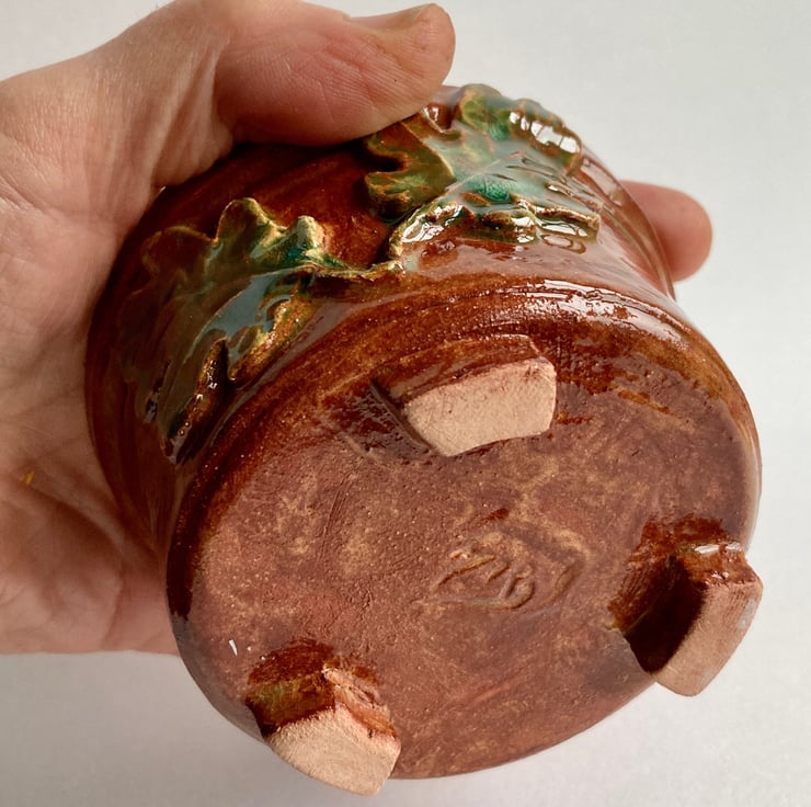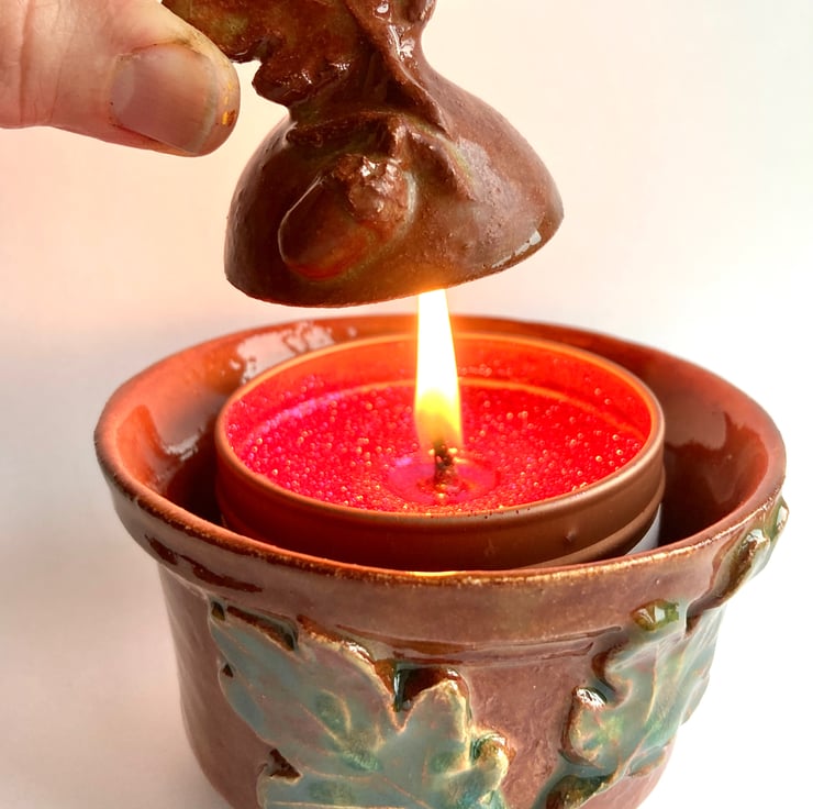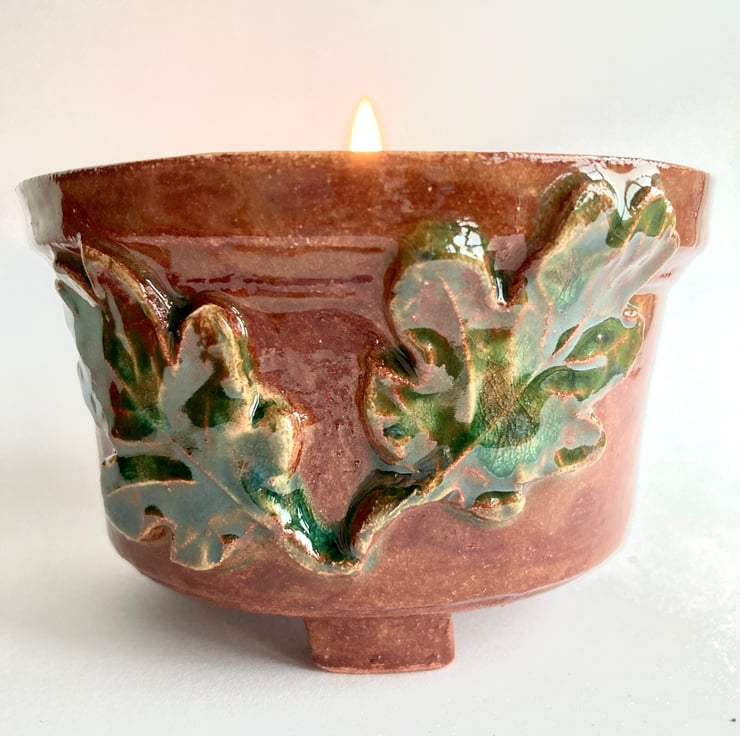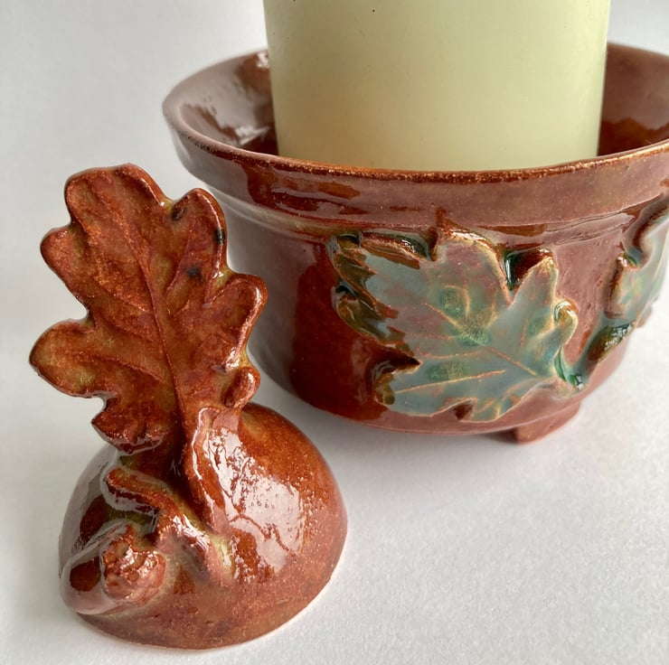 This popular oak themed ceramic candle snuffer has been teamed up here with a hand crafted earthenware pot with three small feet, suitable to hold a pillar or jar candle up to 7cm diameter.