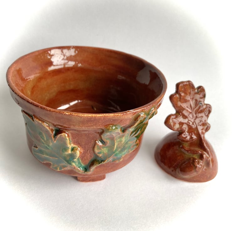 The oak leaf decoration is made from a press mould if an actual leaf and hand finished making no two the same.