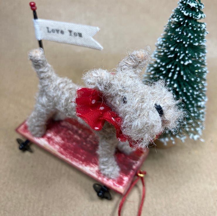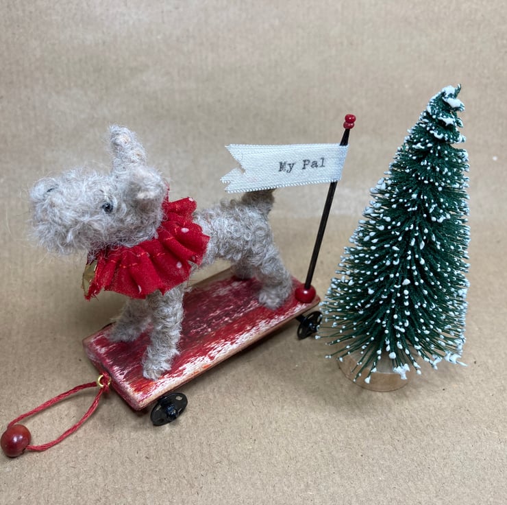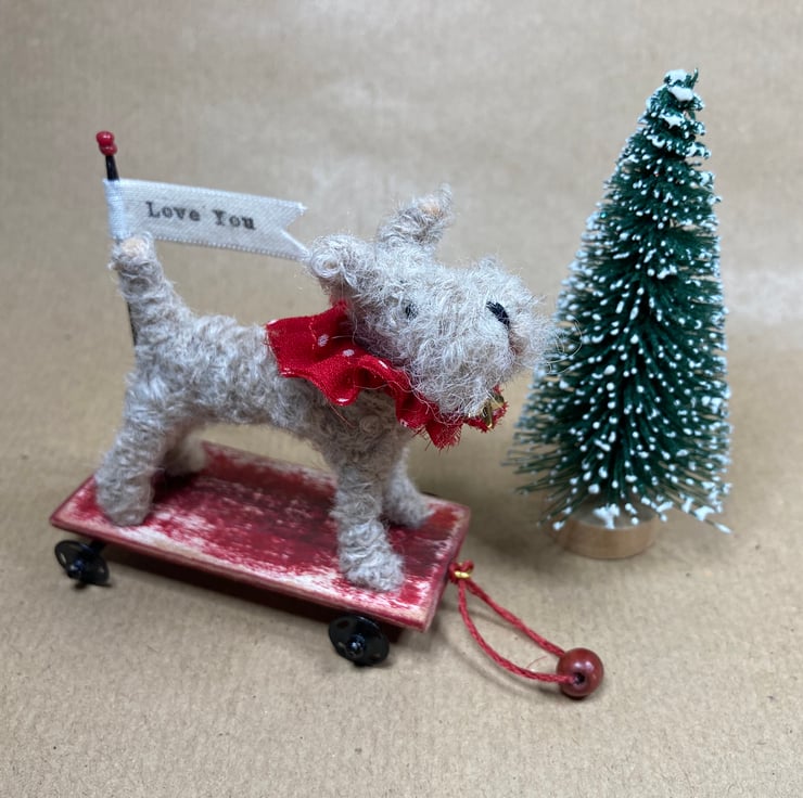 Mini OOAK terrier on a wooden trolley with a flag. Flag reads “love you” on one side and “my pal” on the other side. He stands 6.5 cm tall. He has a red and white spotty ruff with a gold star. He also has a seasonal tree as he may just for Christmas!