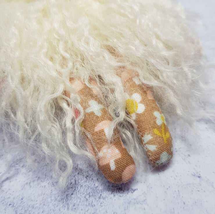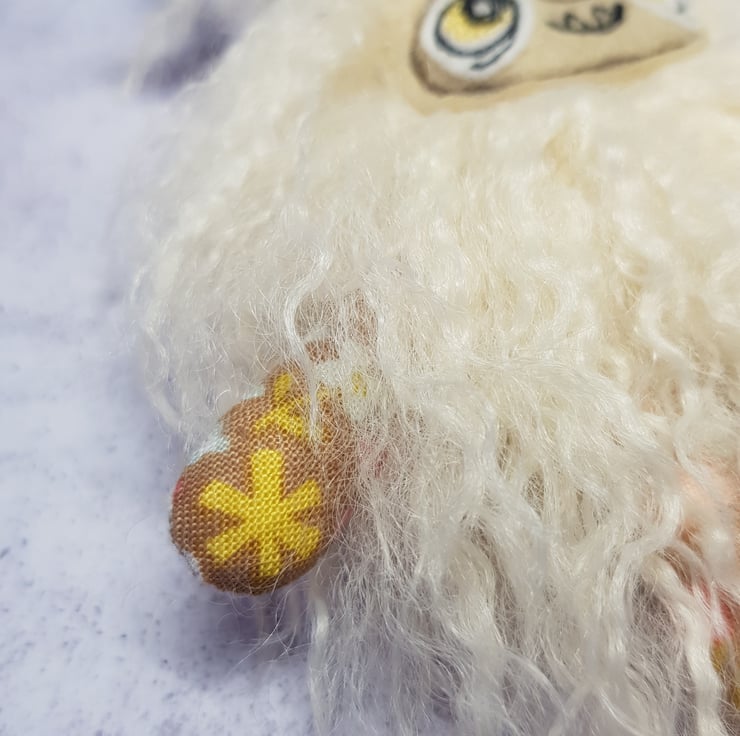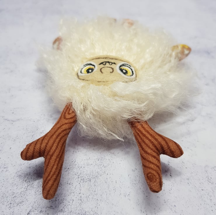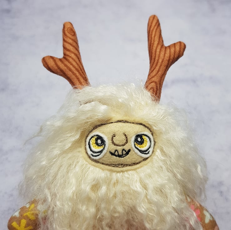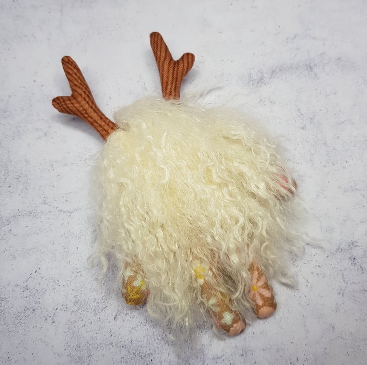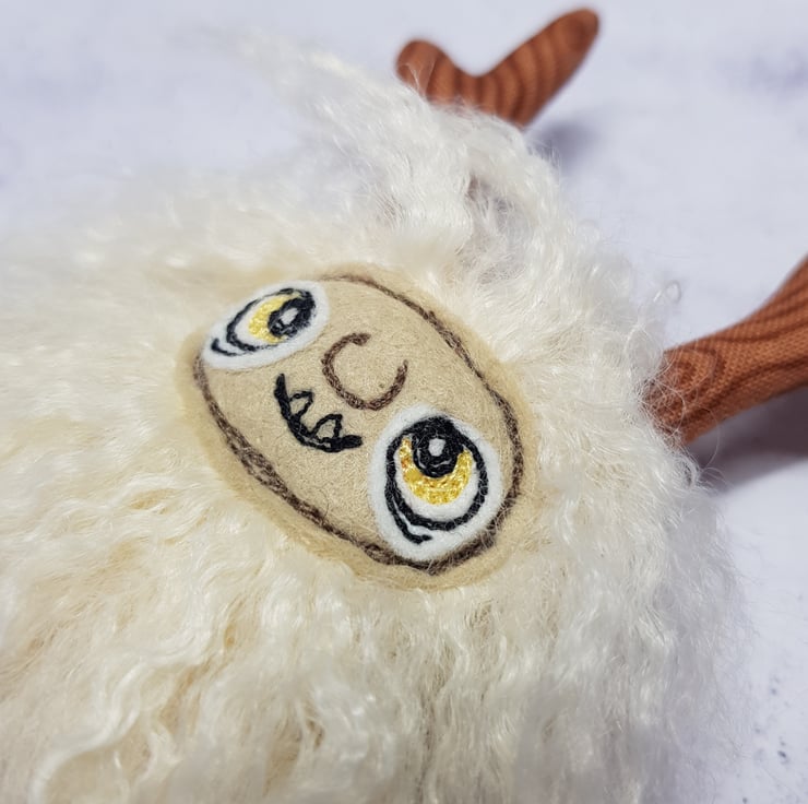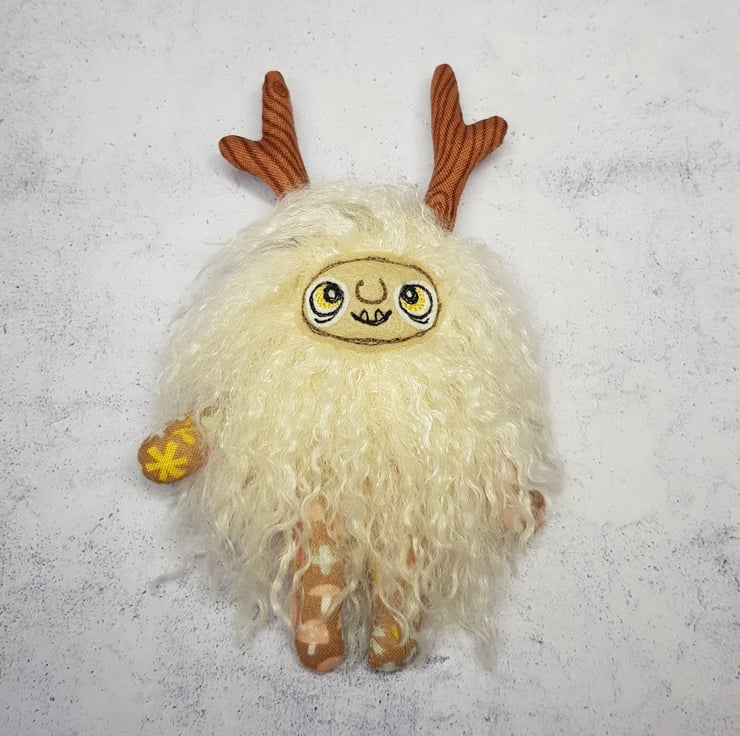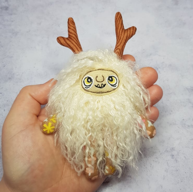 A Miniature yeti decoration made from soft curly faux fur in a long and silky cream. The yeti has free motion embroidered face on felt and woodland print arms and legs. The antlers are hand stitched into place. Yetis measure roughly 14cm tall and can come with a transparent loop hanger if you choose. These are for decorative purposes only and not a toy. Comes beautifully wrapped in paper and string