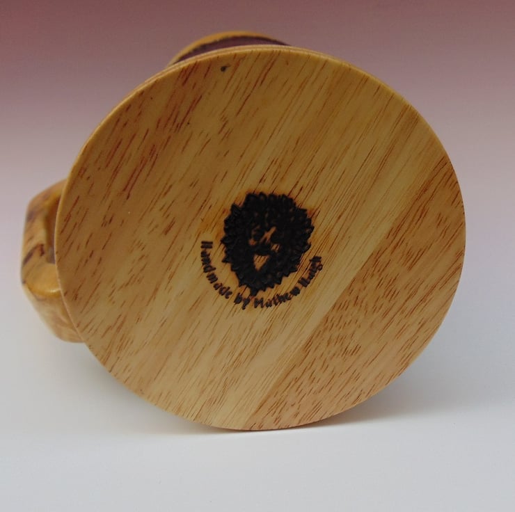 This drinking vessel has been turned from Plywood; twelve individual staves of Plywood glued together, similar to how wooden barrels are coopered. The staves are then attached to a solid base and the vessel turned on a lathe.