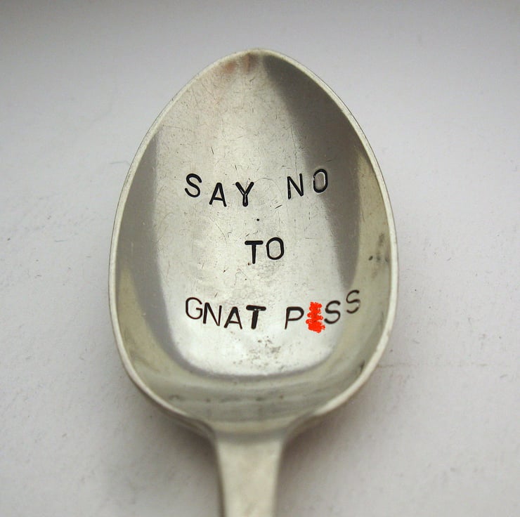 Hand stamped vintage silver plated teaspoon with the words 'SAY NO TO GNAT P-SS' in block lettering. It's the perfect gift for a tea lover who likes it strong! Or the perfect hint to a tea maker who always makes it too weak...
