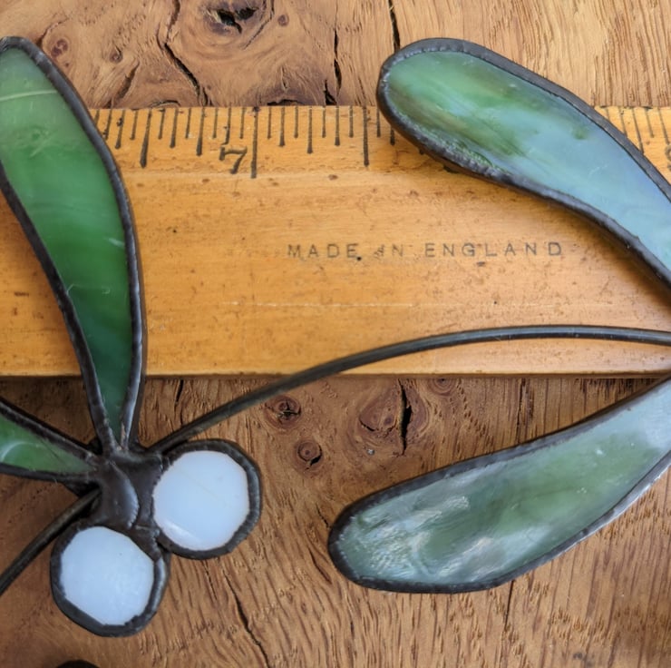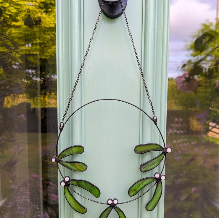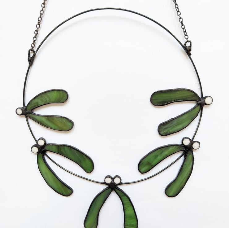 Stained glass mistletoe wreath, in green and white opaque glass. An everlasting heirloom to bring Christmas joy, year after year! The wreath would also make a lovely present for your Christmas host.