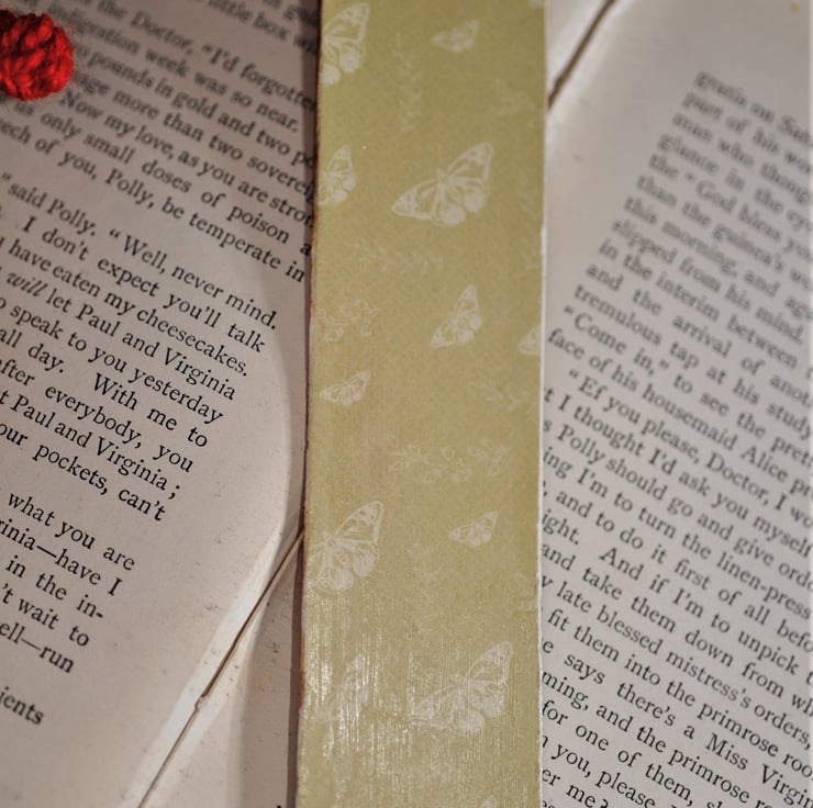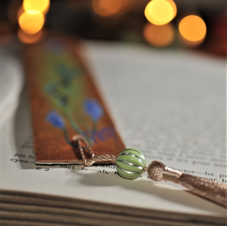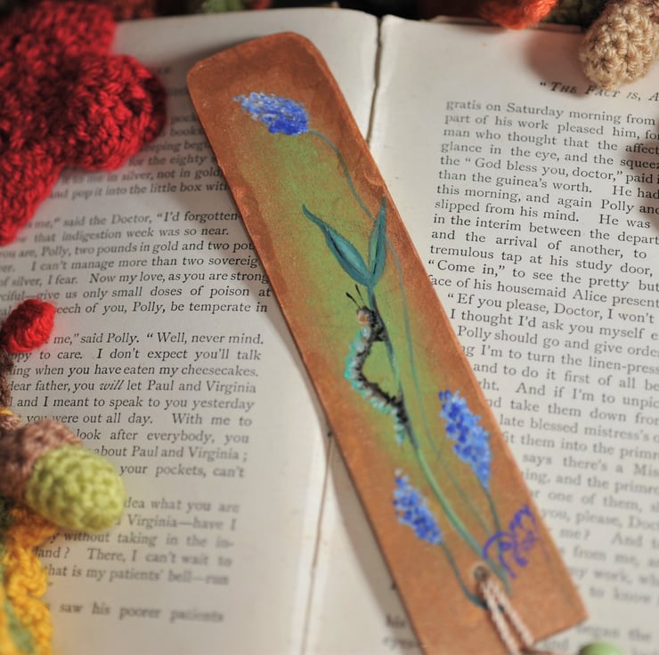 The body of the bookmark measures approx 16cm x 3.5 cm. The rear of the bookmark is decoupage and both sides are finished with a coat of varnish to protect the artwork. Finished with a bead and tassel embellishment in complimentary colours.