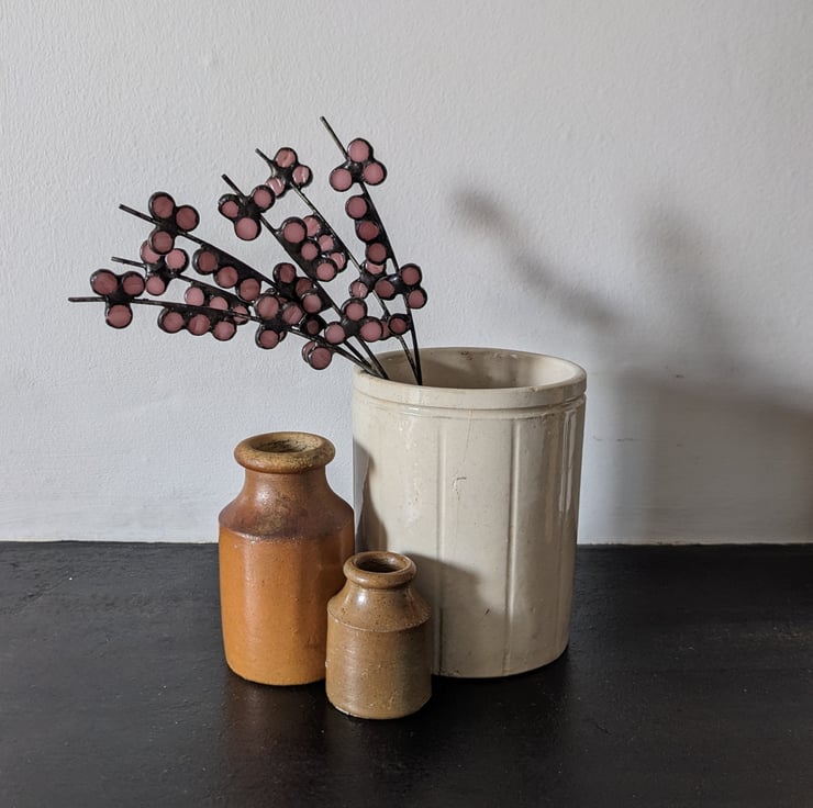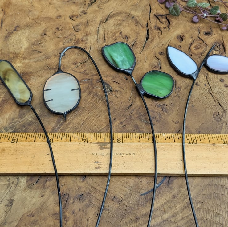 Each stem is handmade to order so may differ slightly from the photos shown here. The stems are approximately 18 cm tall. Fill your vase with dried rice/lentils or sand to hold the stems in place and adjust their relative heights - this also means you can use a taller bottle. The flowers look lovely either together in one vase, or displayed individually, and use of opaque glass mean they look just as good in the low light of the interior of your house, as they do against a window.