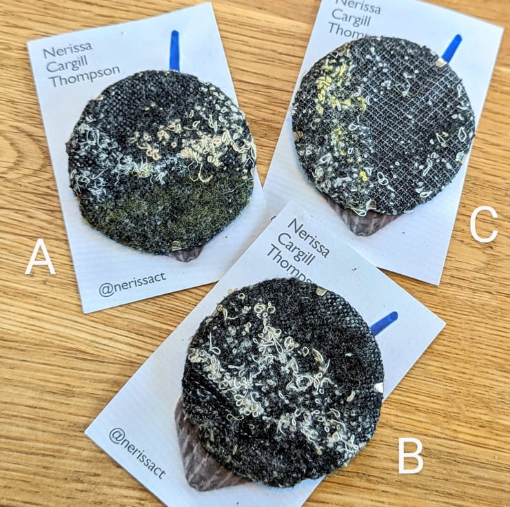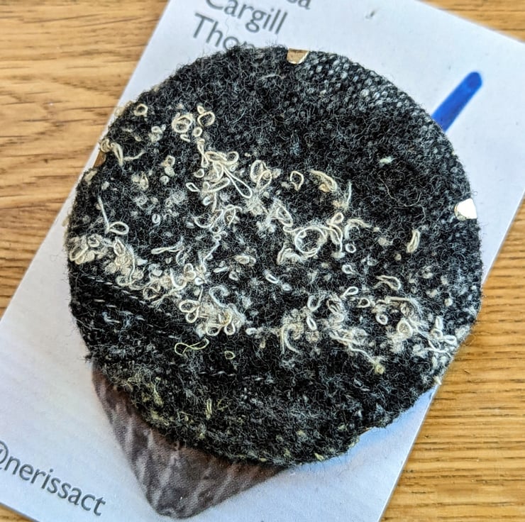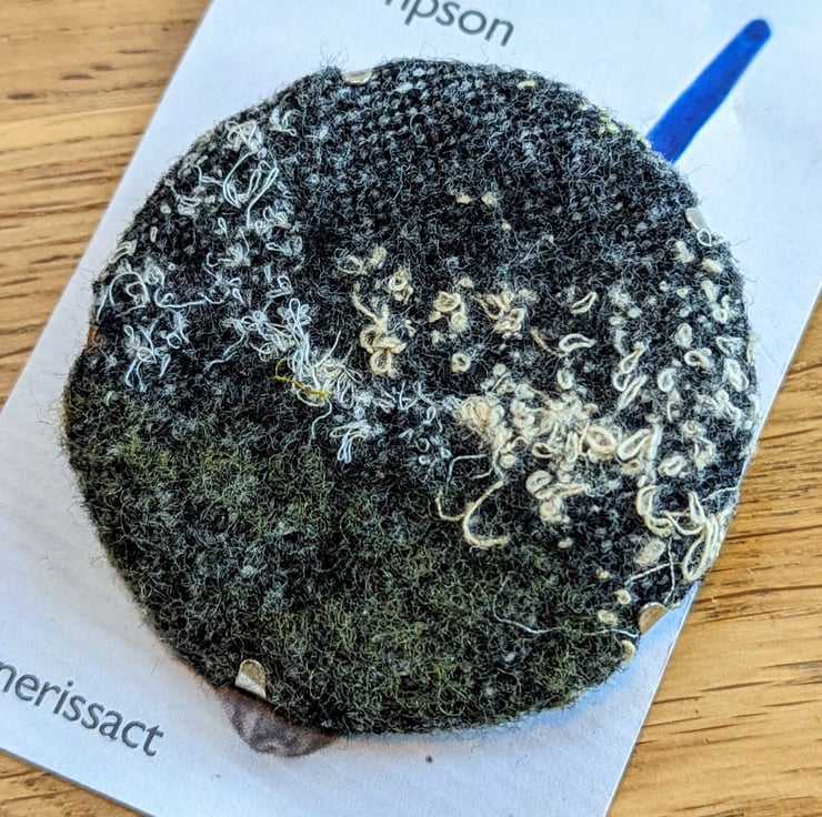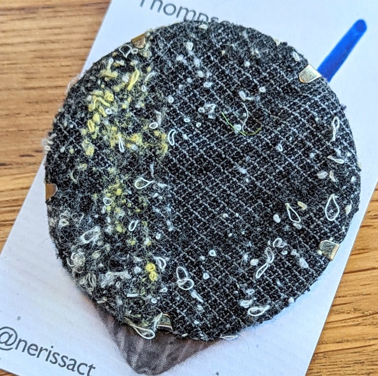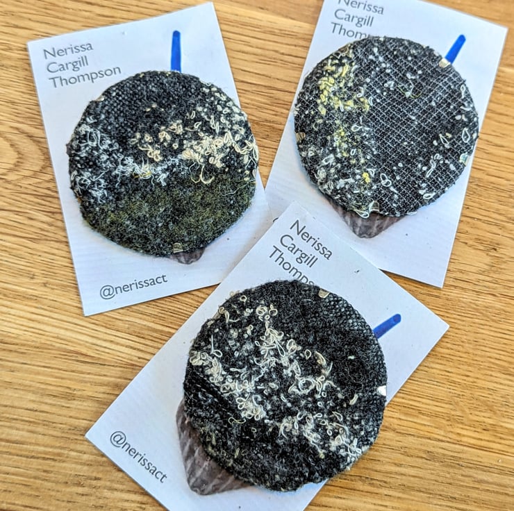 To limit my waste, I turn my colourful textile offcuts into jewellery. The embellished textiles are mounted onto 65mm commercial brooch backs using a strong fabric glue and have a standard rolling safety clasp.