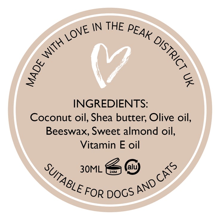 Recyclable aluminium tin. Contains 30ml. Our ingredients contain no nasties but as with all skin products, if you notice any irritation on your pet after using then please discontinue use.