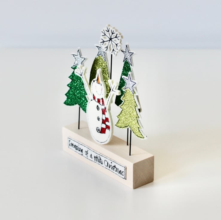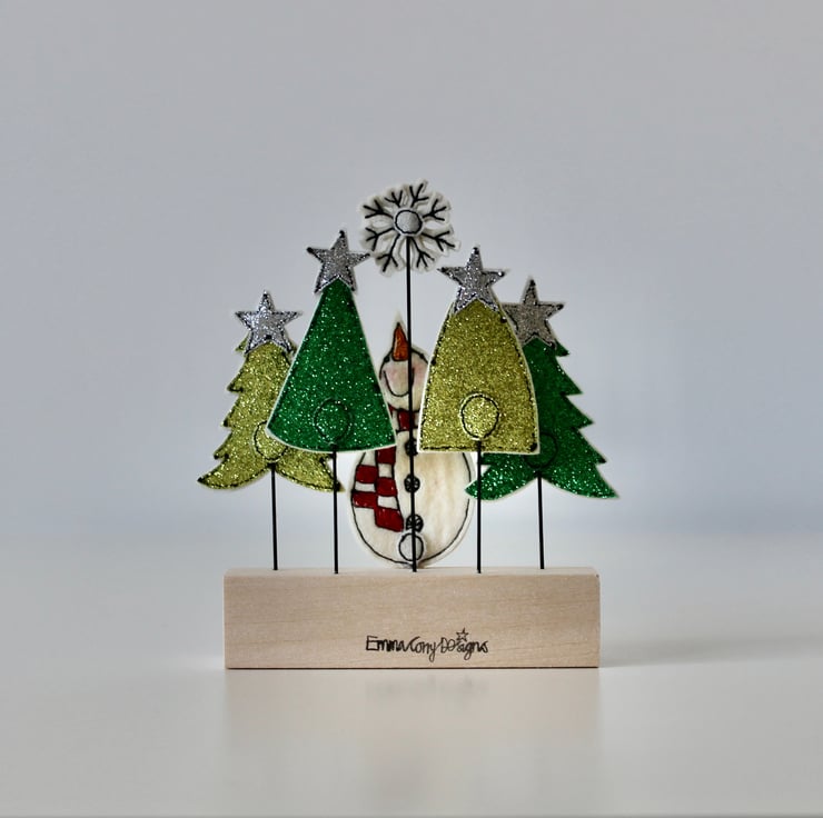 Mr Snowman and the glittery trees are created using 100% wool felt, glitter cloth, free hand machine embroidery and cut out by hand using very sharp scissors. They are mounted on a 10cm by 2cm rectangular wooden block, which can adorn a mantle piece or any flat surface.