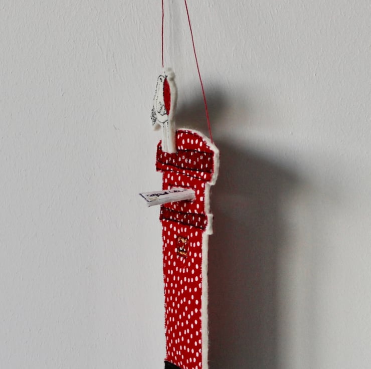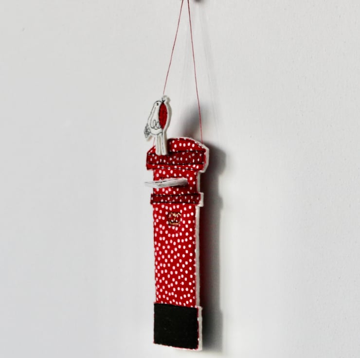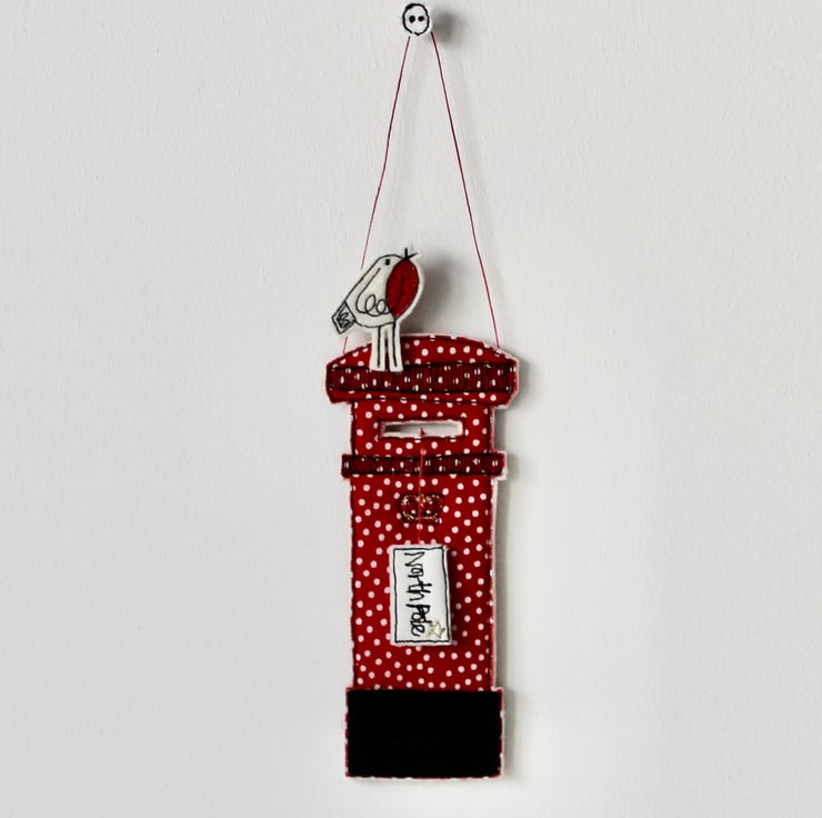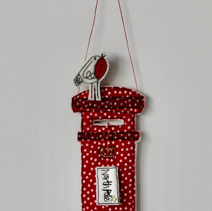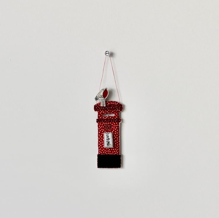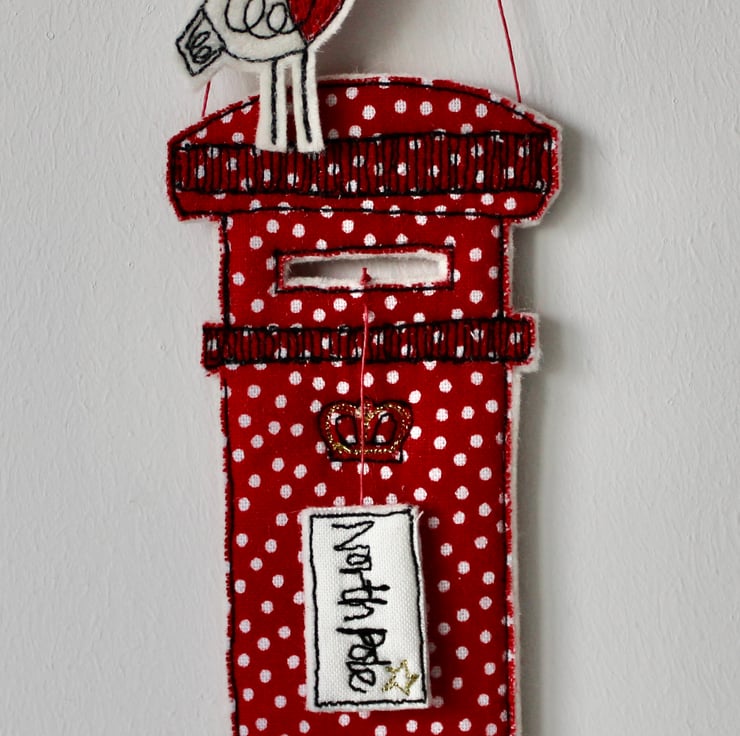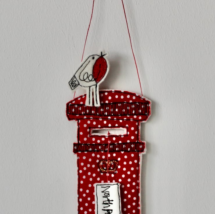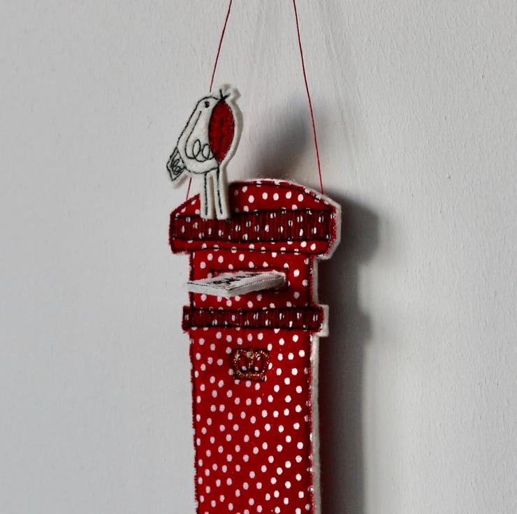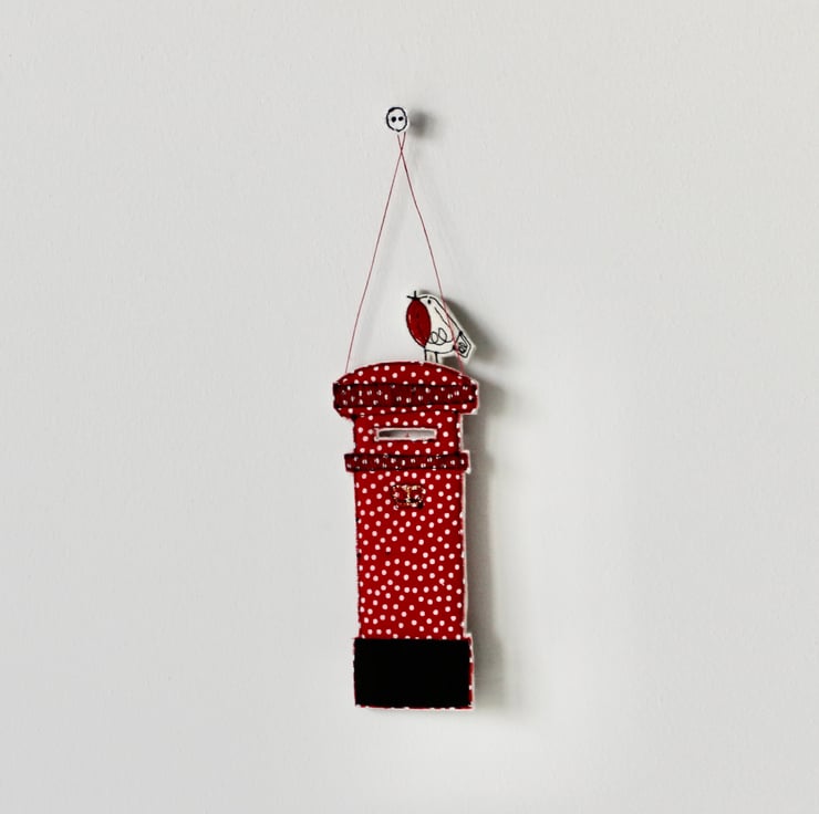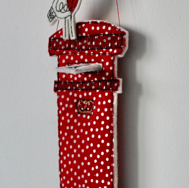 Little dotty posting box is created using 100% wool felt, cotton cloth, metallic thread, linen thread and free hand machine embroidery. There is a cut out slot for the little letter to be posted through and a linen thread to hang.