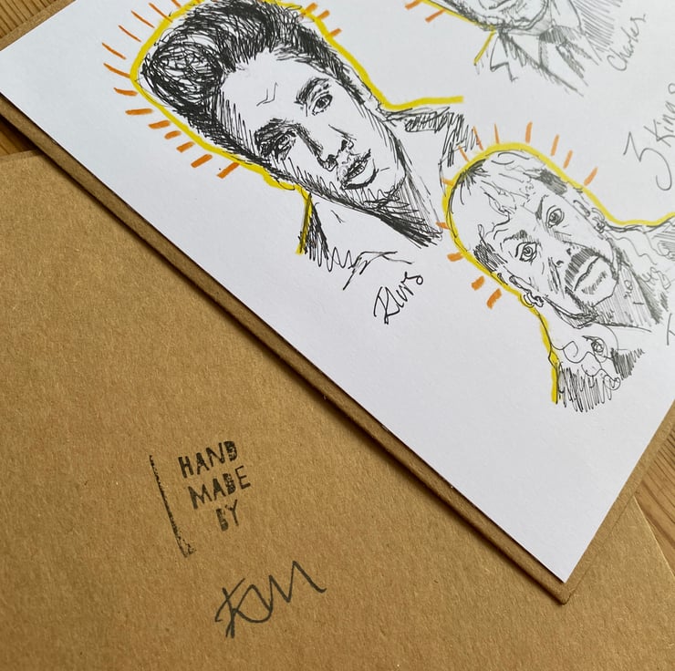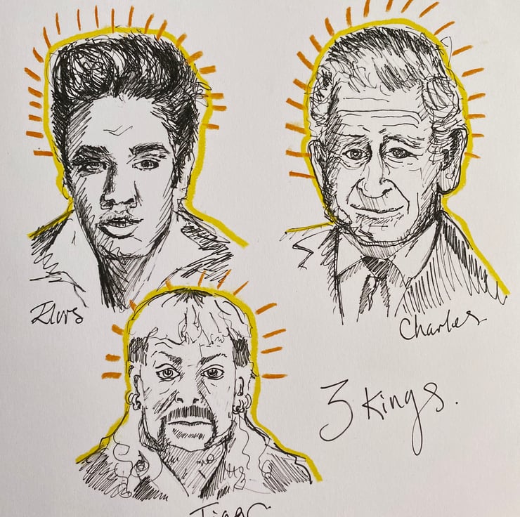 Handmade and illustrated Christmas Card of the 3 Kings! Elvis, King Charles and The Tiger King!