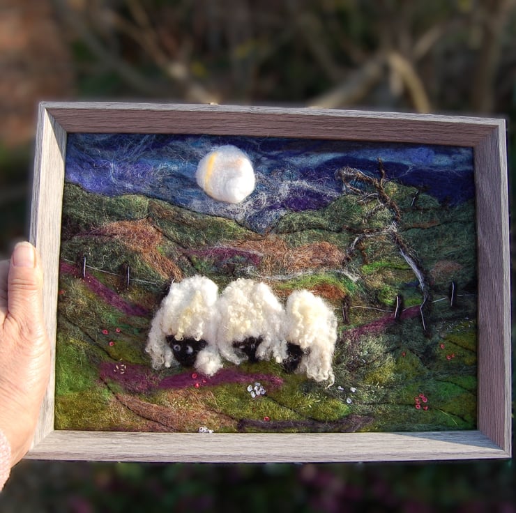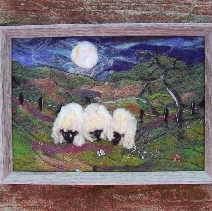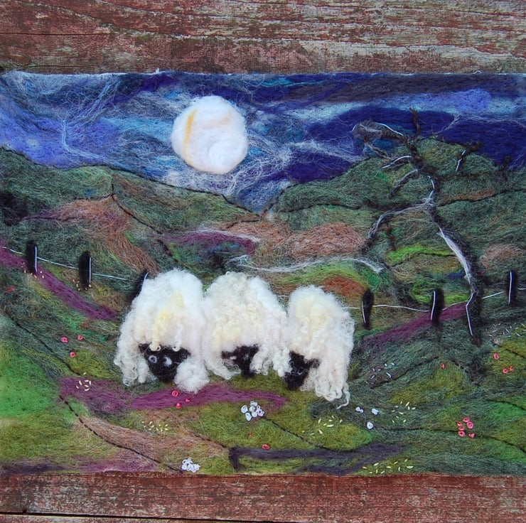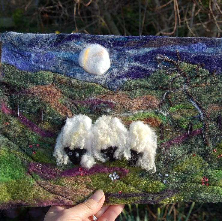 I've gently jabbed wool fibres onto a piece of vintage blanket to create the background for this art work. White sheep fleece for the sheep. Hand embroidery adds texture.