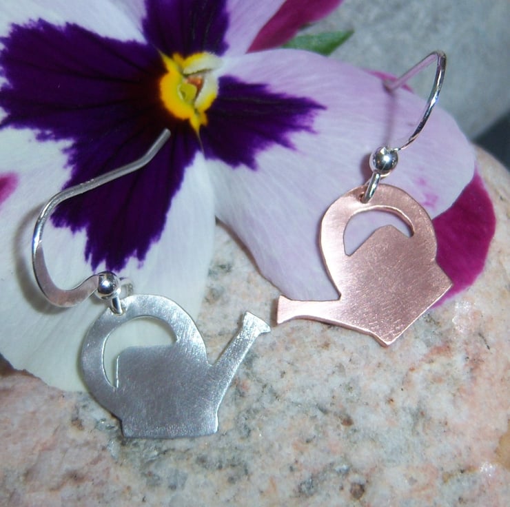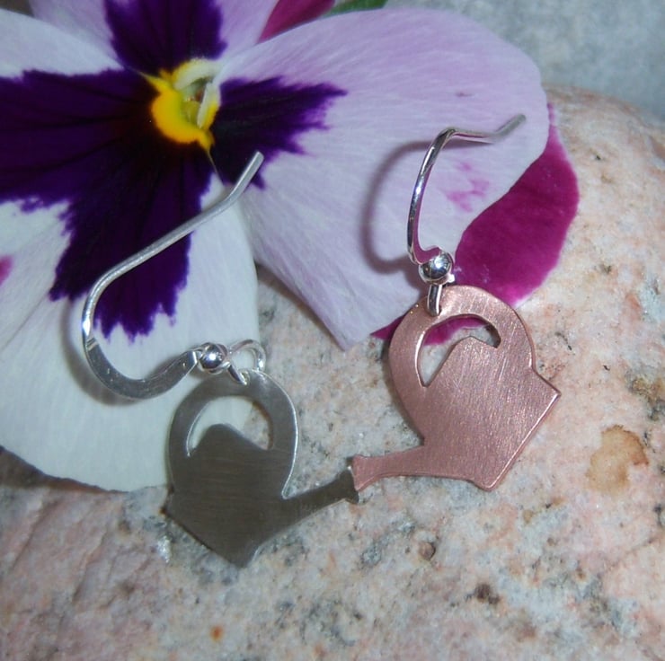Watering cans handcut from sterling silver and copper sheets - one of each. Sterling silver ear wires. Approximately 1.5cm drop.