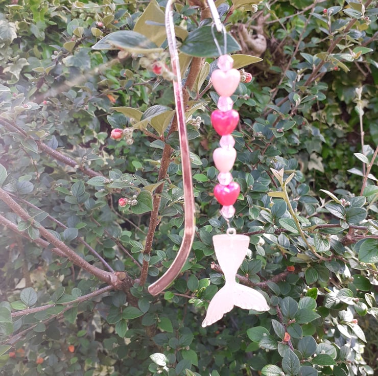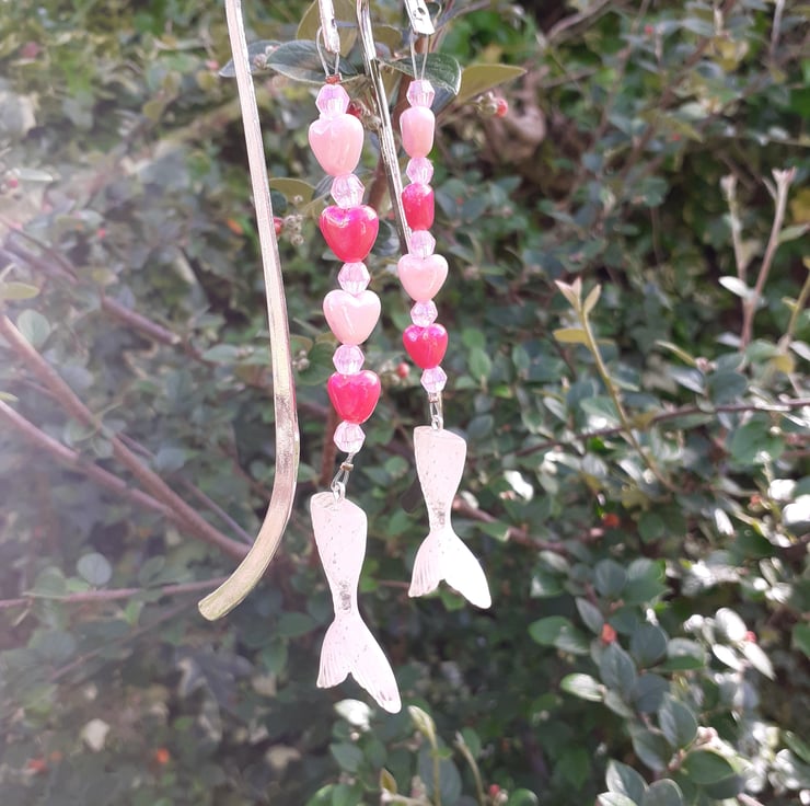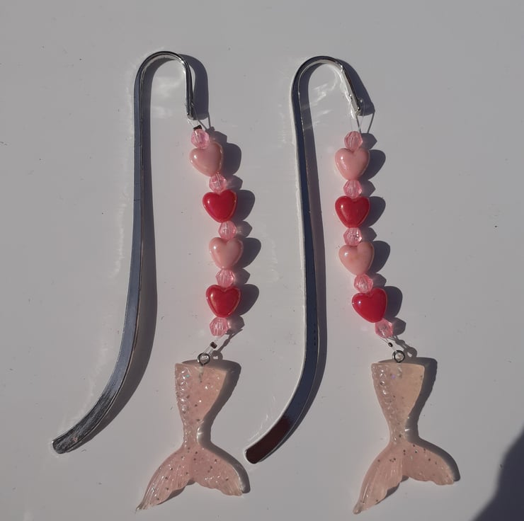 This bookmark has a silver coloured metal hook and I have put together pale pink and dark pink heart shaped beads and sparkly beads above a gorgeous very pale pink sparkly resin mermaids tail.