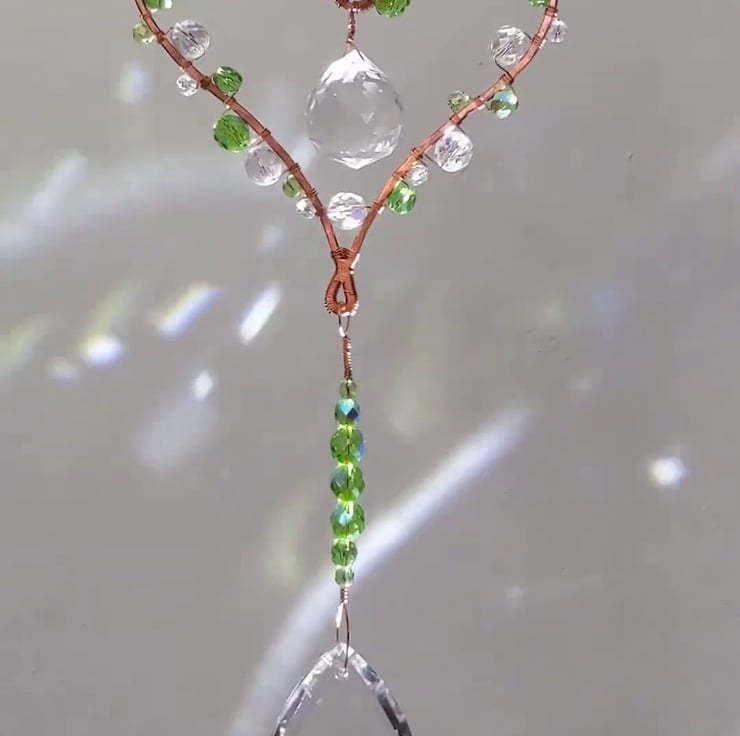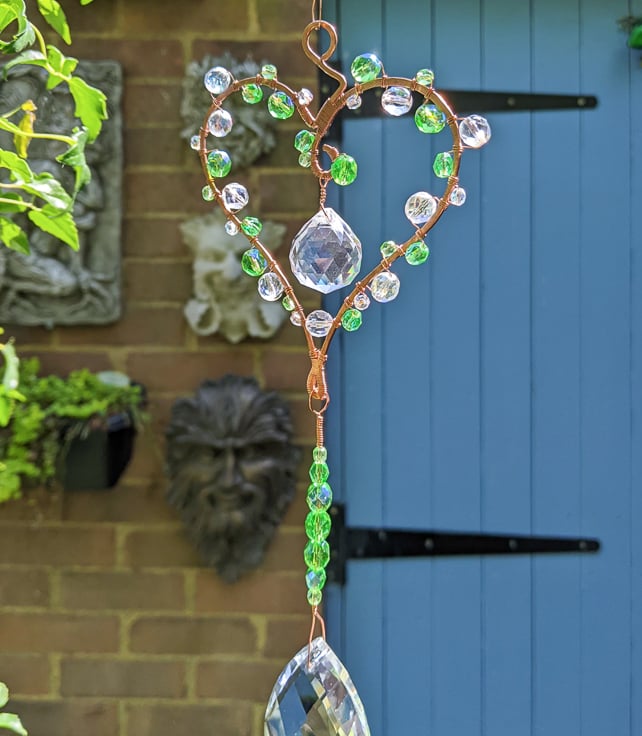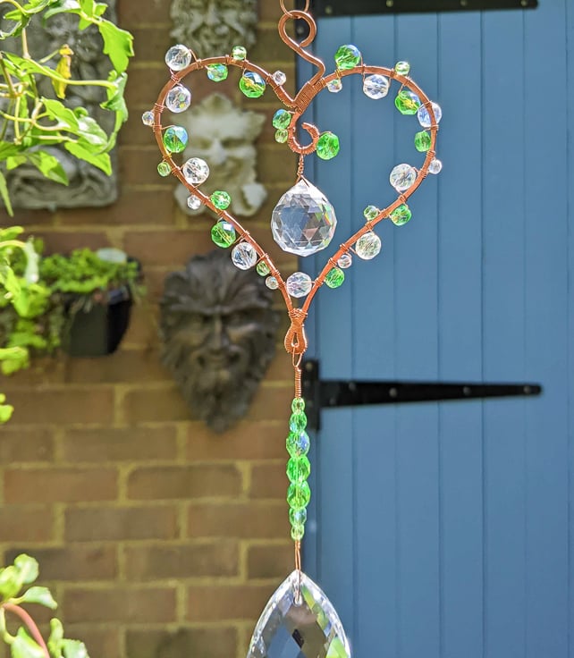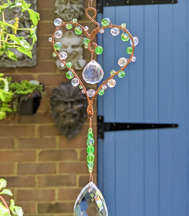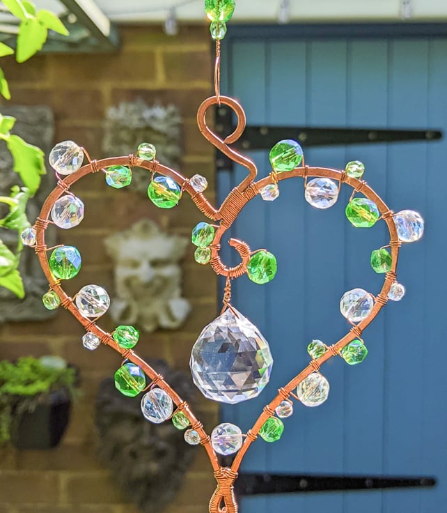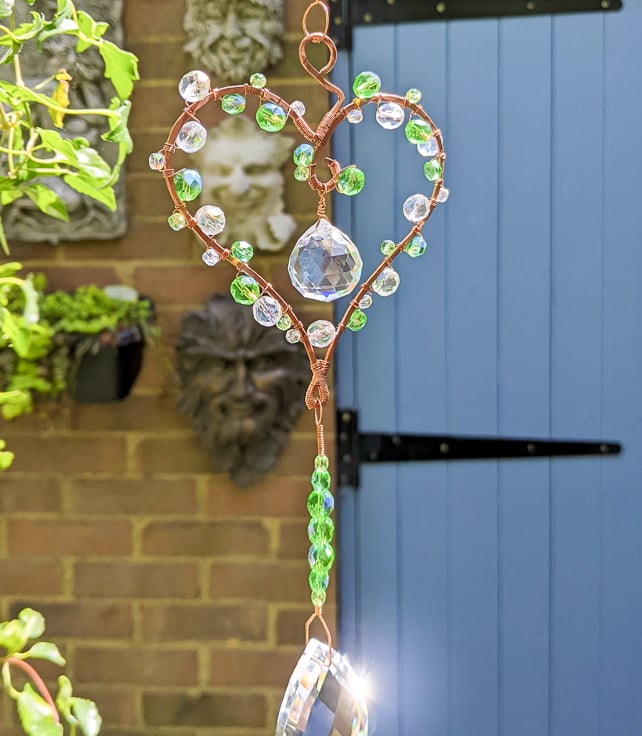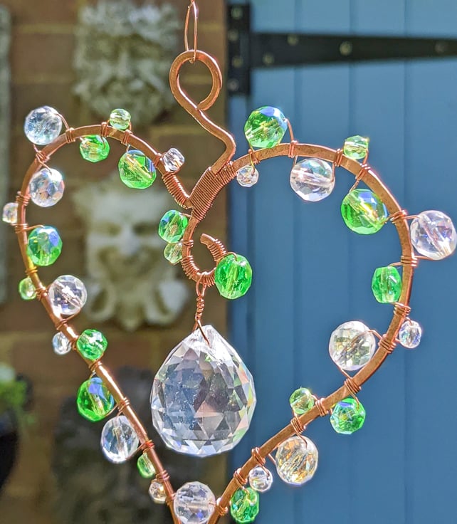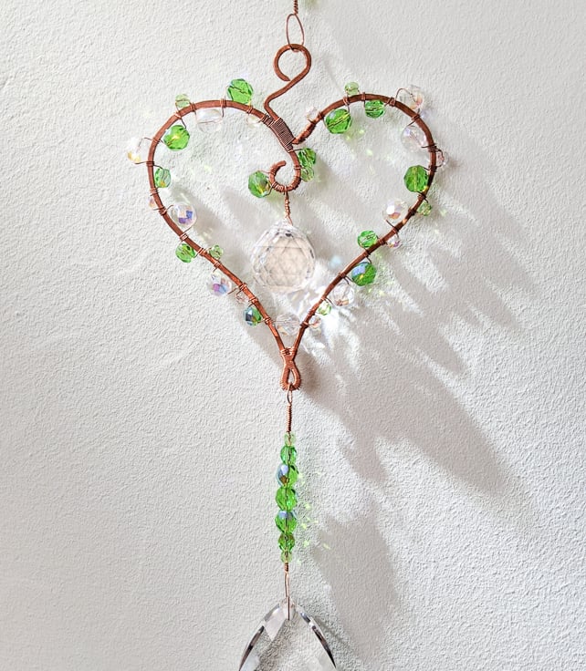 This sun catcher has been handmade using 99.9% pure copper wire. It has been softly hammered into a heart shape, this gives a pretty texture and hardens the copper.