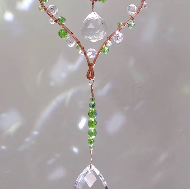 We have then wire wrapped a mixture of Preciosa Czech Glass beads and attached two sparkly prisms. It has a hook built in, ready for hanging.