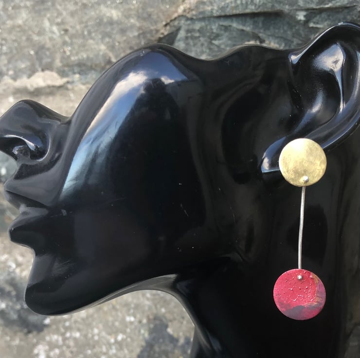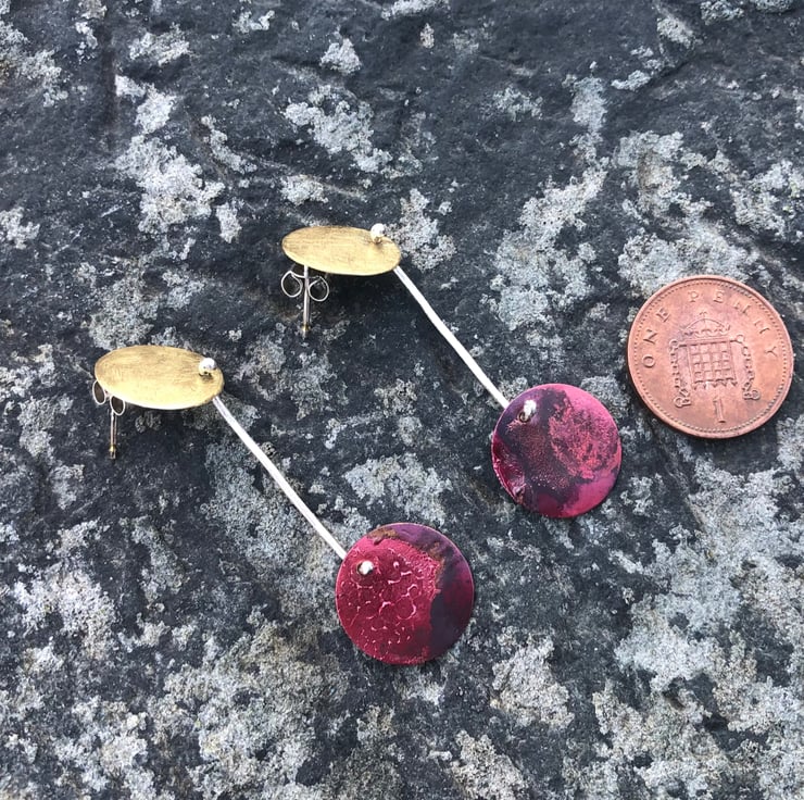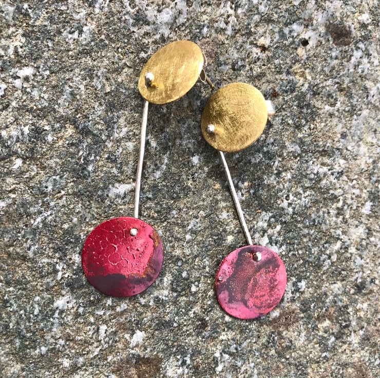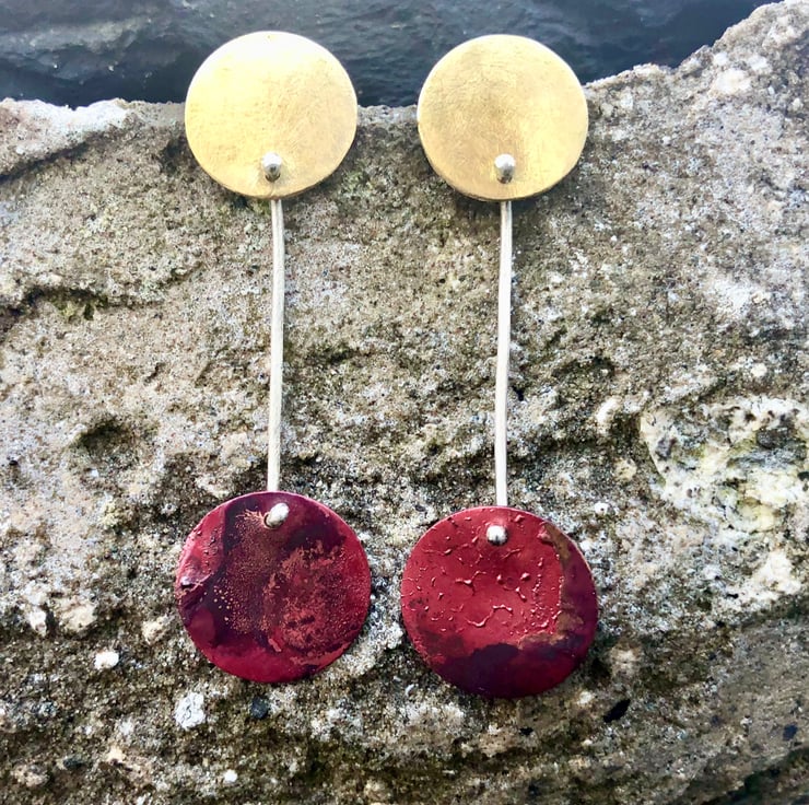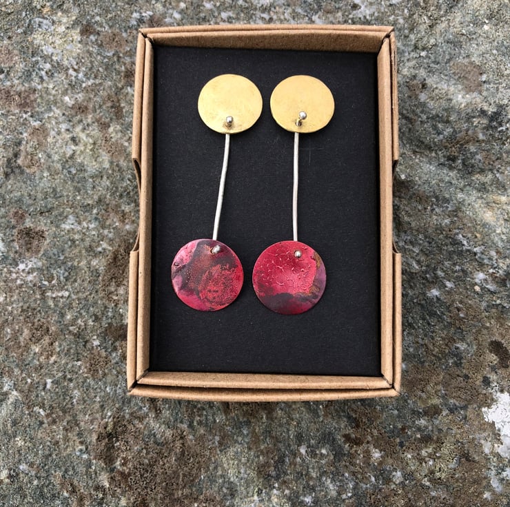 Copper circles hang from brass circles to form articulated dangle earrings with Autumn colours. The copper disc has luscious red, dark red and purple colours together with some surface texture; in contrast to the frosted , matt surface of the brass disc. The brass circle sits neatly on the ear with sterling silver stud fastenings. The circles are joined together with a piece of eco sterling silver wire .