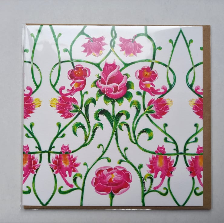 A cat themed greetings card, blank inside for your own message. How many hidden cats can you find? Brown paper envelope. Wrapped in biodegradeable, plastic-free wrap and perfect for all sorts of greetings messages you might want to send.