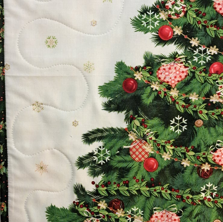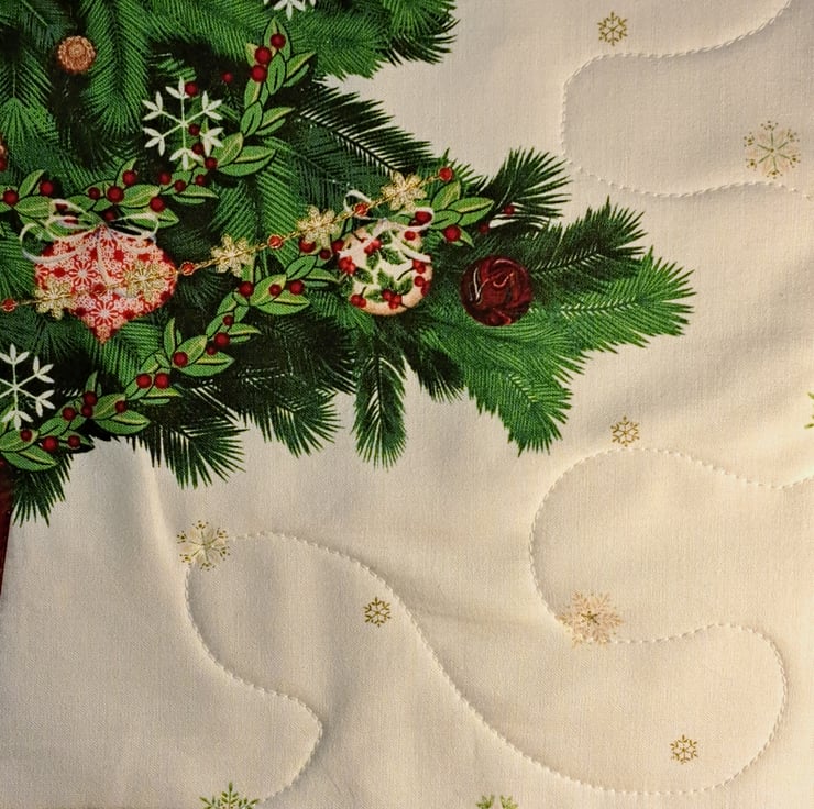 Quilted Christmas table or wall decoration with wonderful detailed Christmas tree pattern. This nice Christmas home decor quilted fallowing the ornaments on the Christmas tree and also quilted arround the tree. Can use as a centerpiece of the Christmas table or because has loops on the back also can use as a wall hanging( see picture 6th). The main colors are burgundy, forest green and red with golden metallic details on white background. The pattern also contains cardinal birds and snow drops. Dimenions: 72cm x 52cm