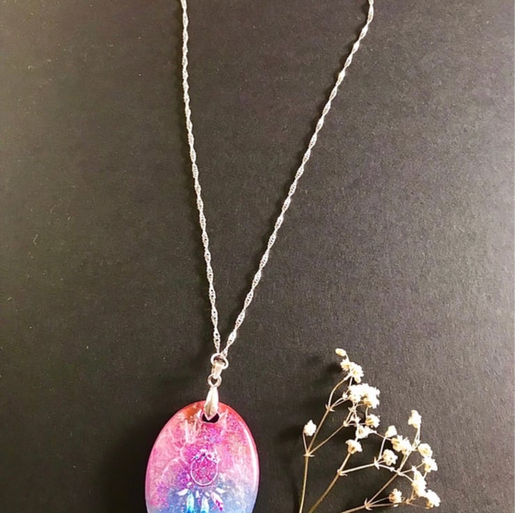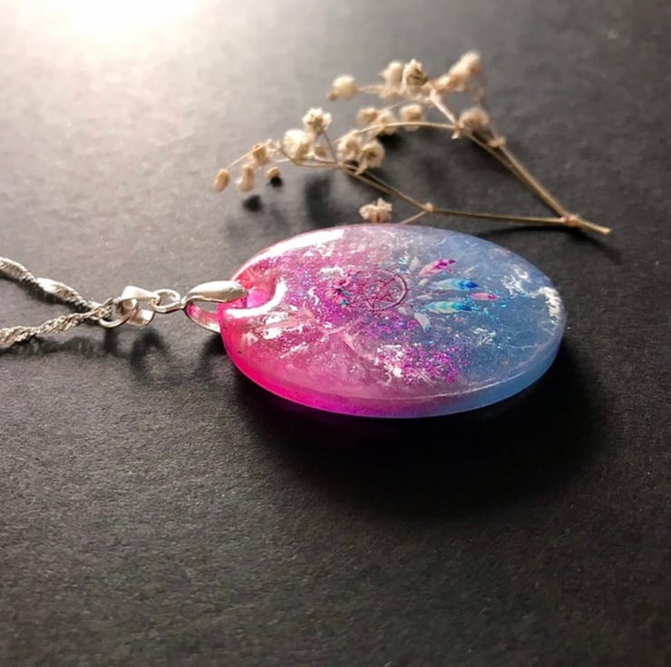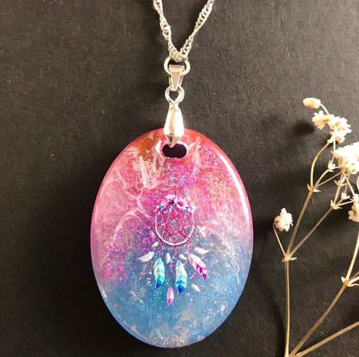 Handmade Hand Painted Ethereal Dazzling Iridescent 'Dream Catcher' Necklace. Swirls of iridescent delicate pink and blue with glitter flakes and topped with a beautiful dream catcher. Suspended from a silver chain.