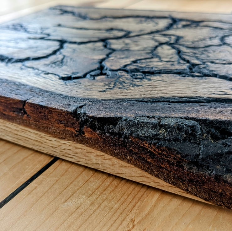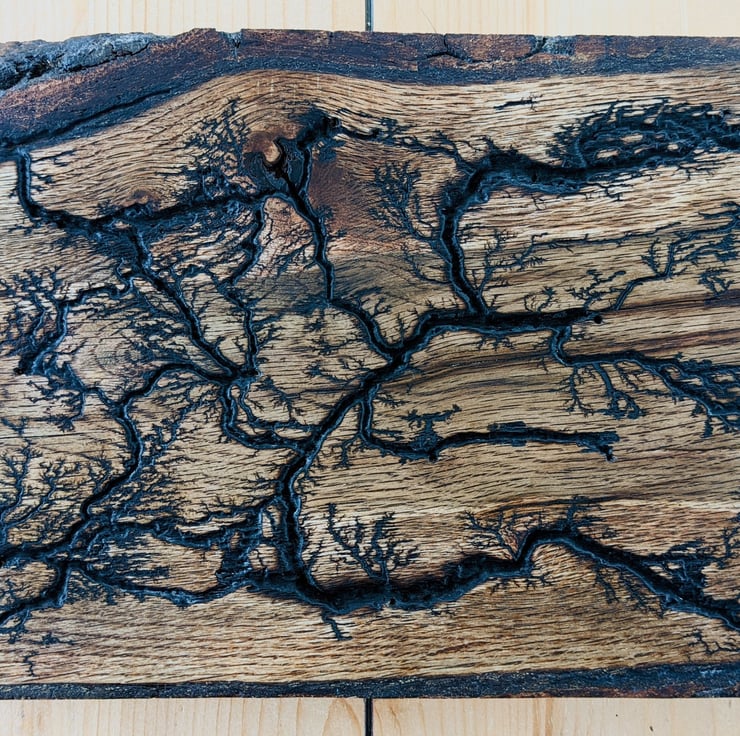 These Handmade pieces are made from locally sourced Oak slabs, We then shoot 2200v of electricity through them to burn unique pattens into the wood! We then seal each item with clear wax and a coat of Osmo oil which is food safe, great as a serving platter!