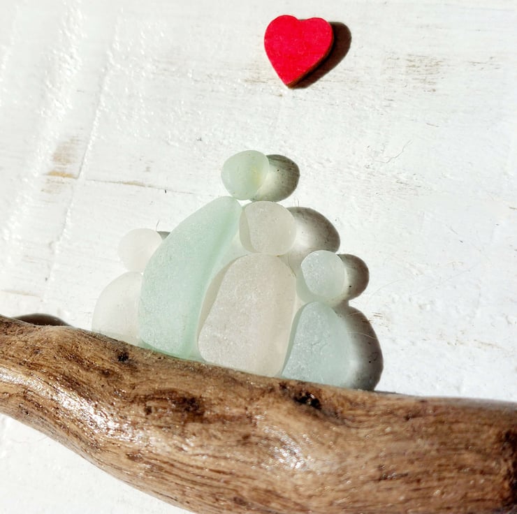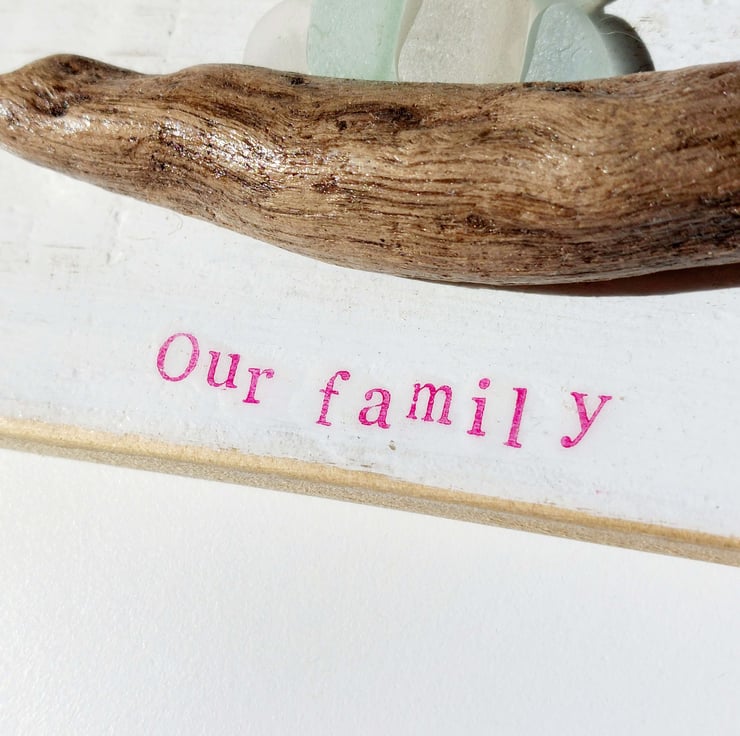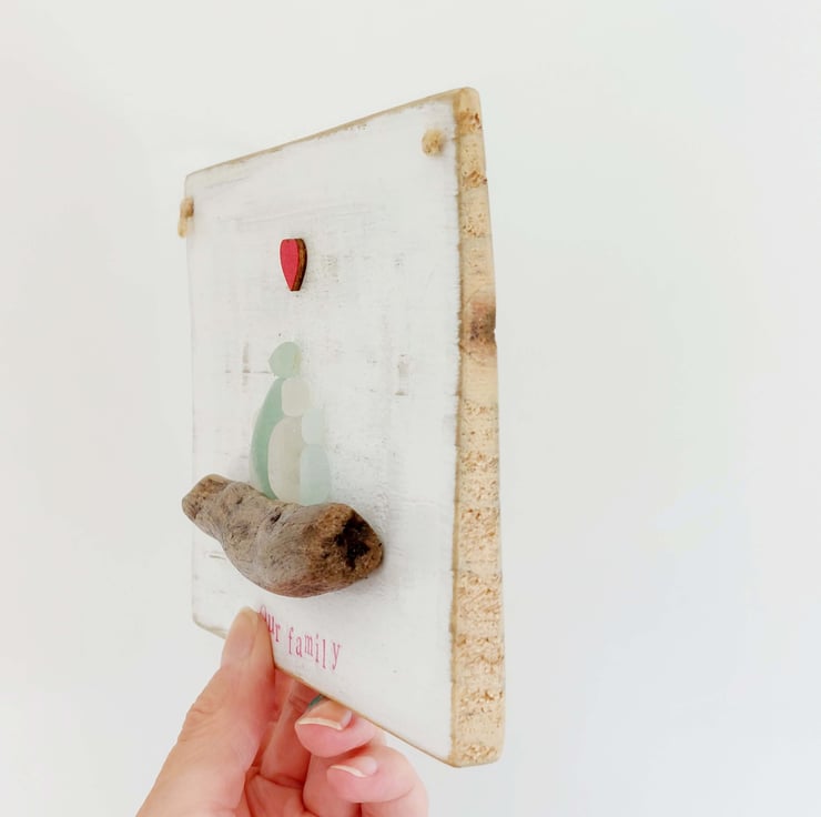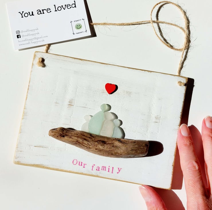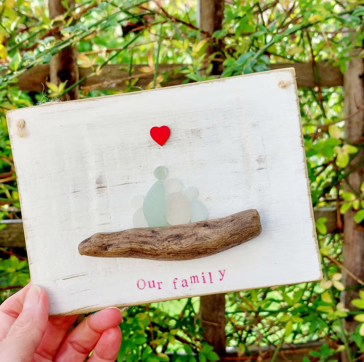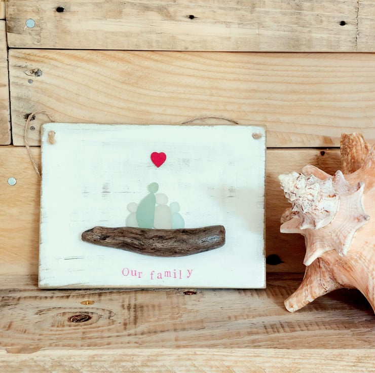 Give a unique and special gift with this sea glass family reclaimed wooden hanging wall art. Perfect for new families, it adds a touch of natural beauty to your space and is crafted from beachcombed materials and reclaimed wood, making it totally sustainable. The backing board is reclaimed fence panelling that has been sanded, cut, painted and embellished by hand with sea glass and driftwood. There are 4 family members and the words 'Our Family' has been stamped underneath in pink. A red painted wooden heart sits above the family. This original design includes naturally tumbled and frosted sea glass collected from my beachy travels.