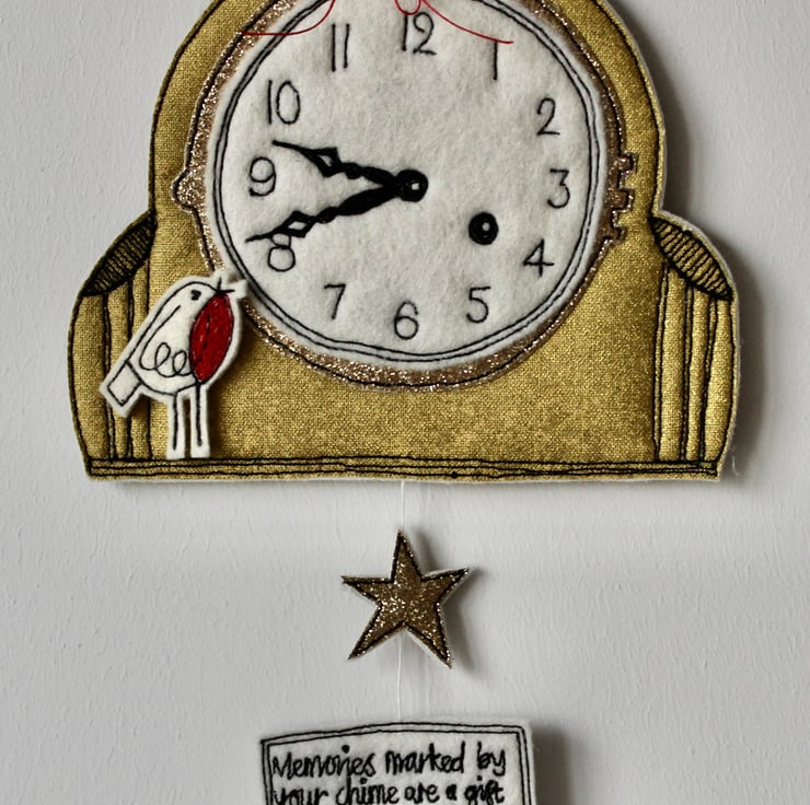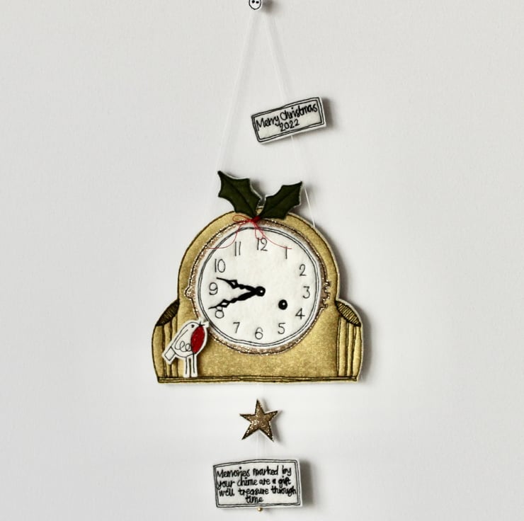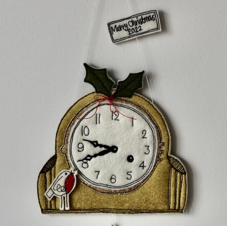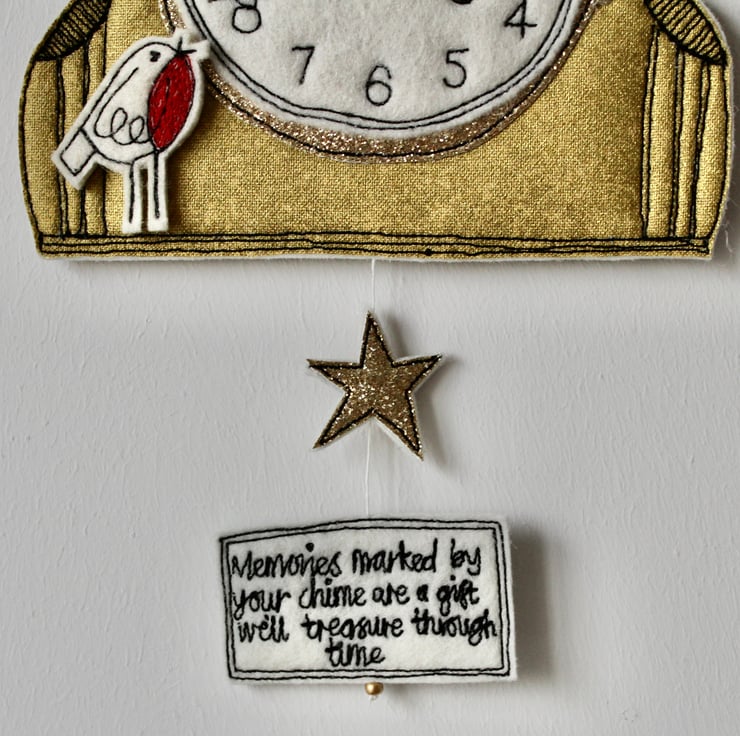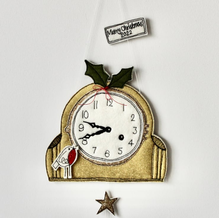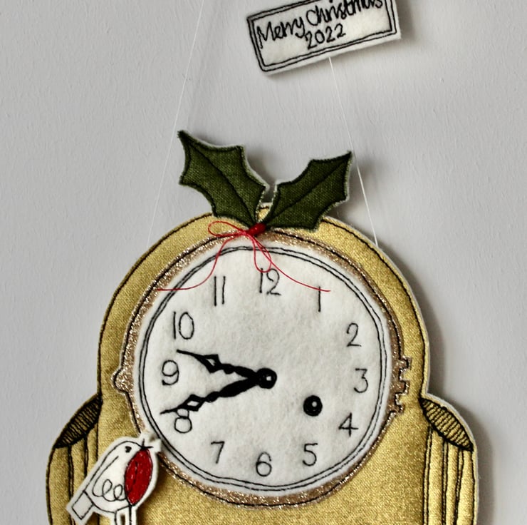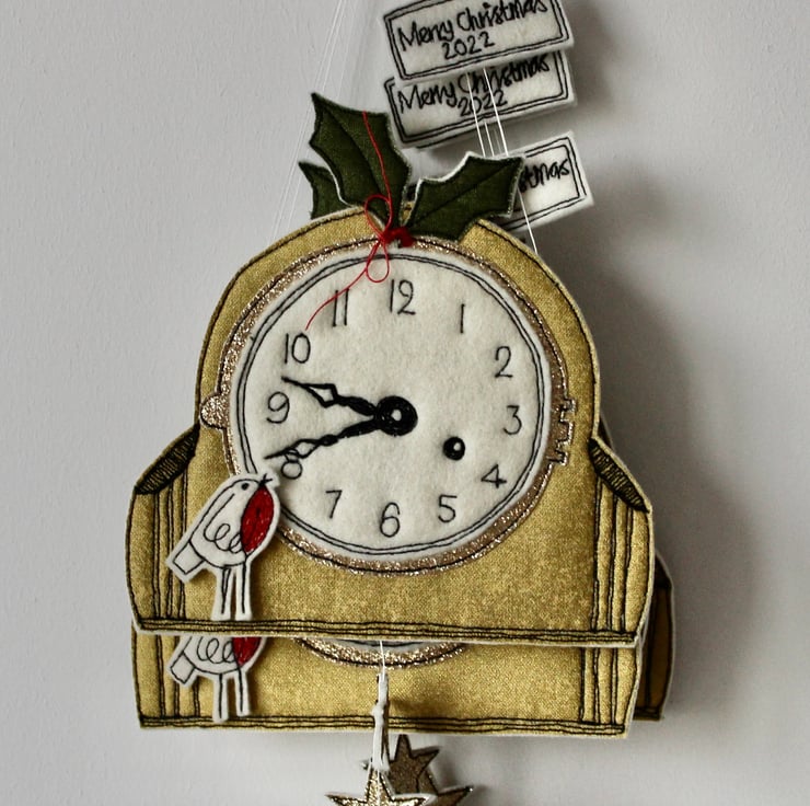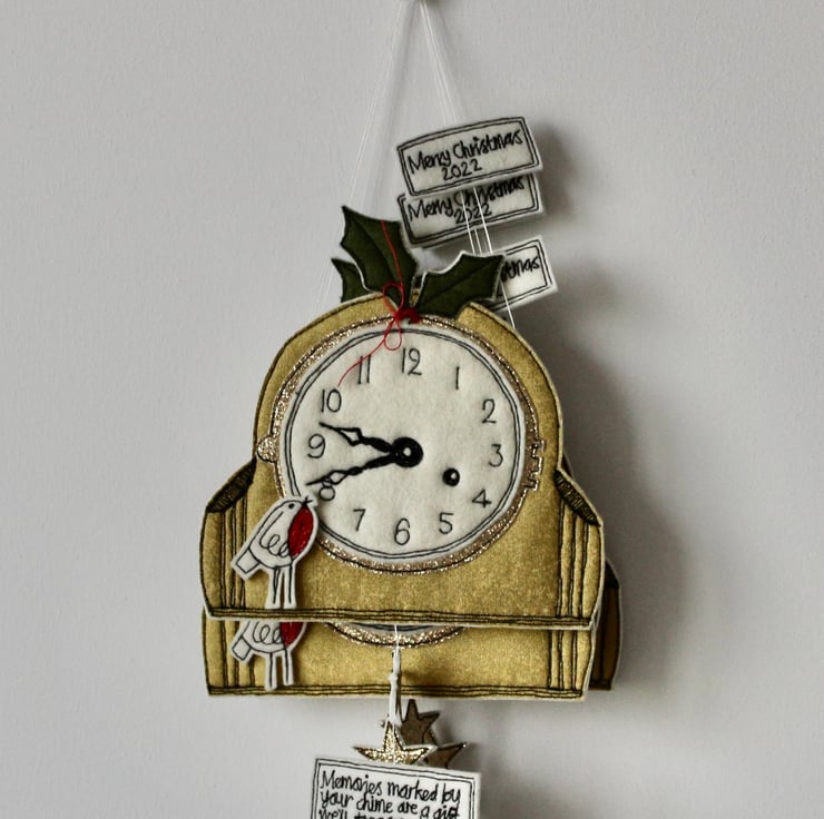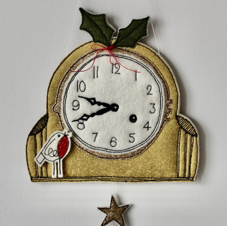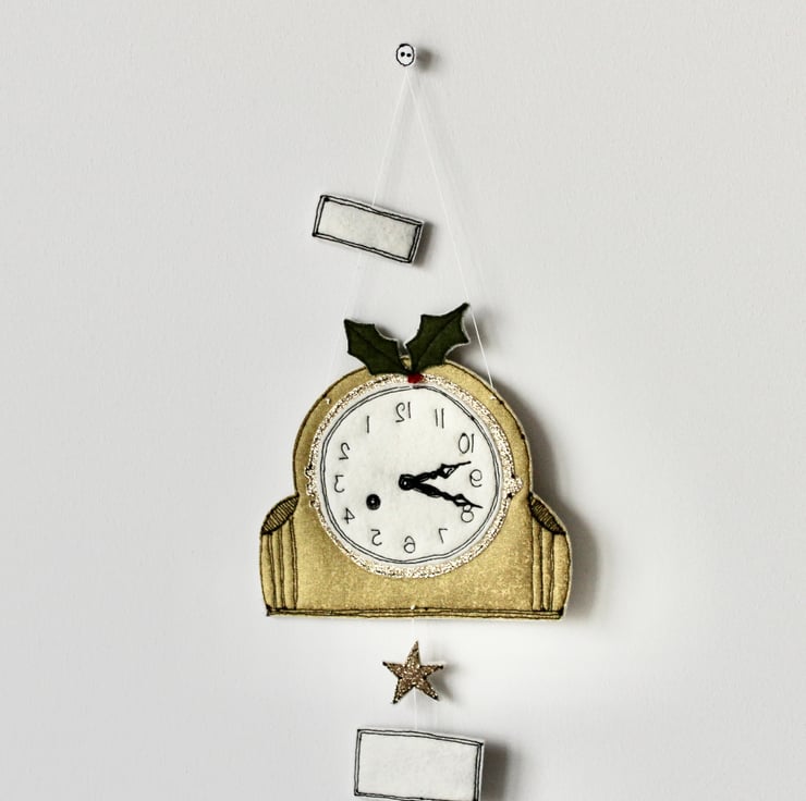Special clocks are created using 100% wool felt, glitter cloth, cotton cloth, free hand machine embroidery and are cut out by hand using very sharp scissors. Little glass beads make perfect berries with a linen thread for hanging.
