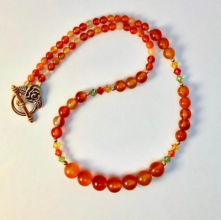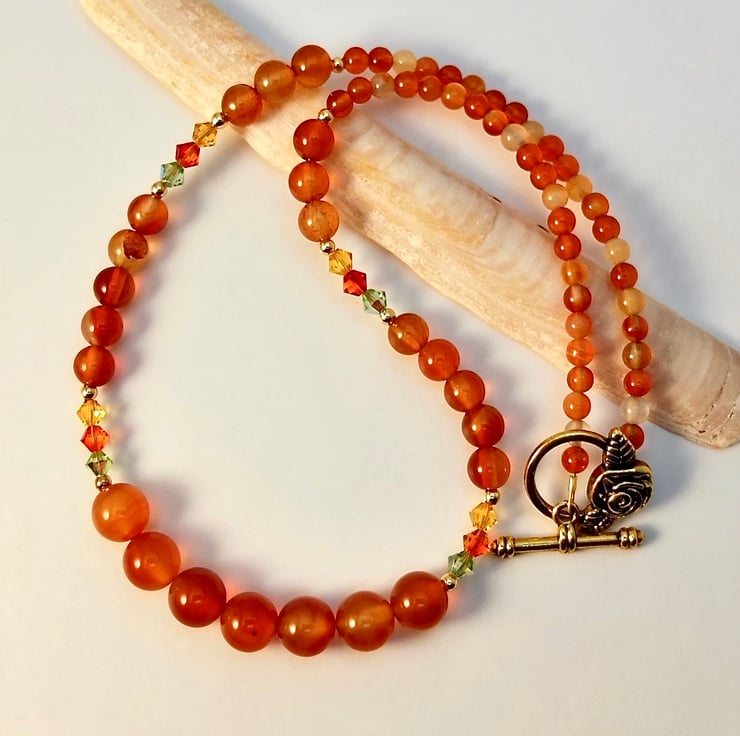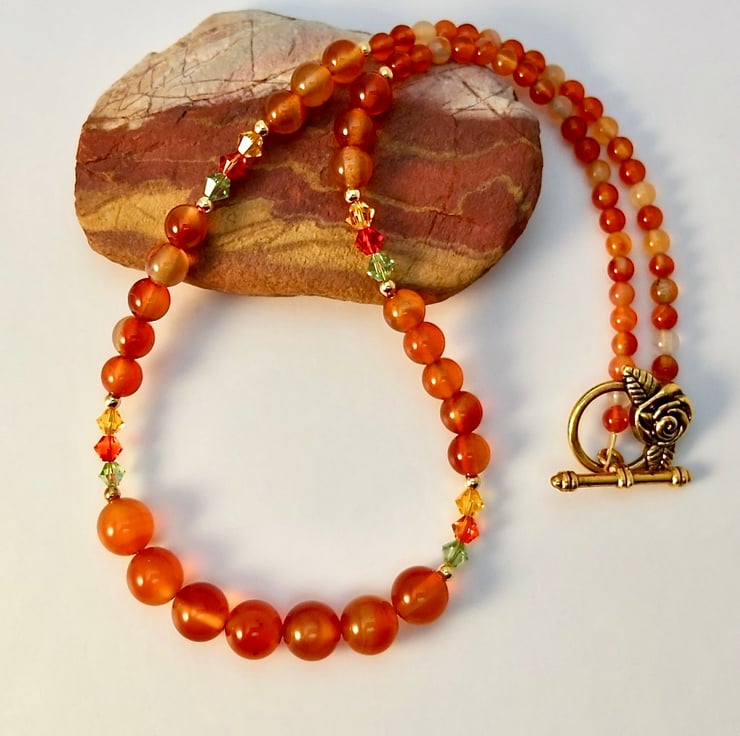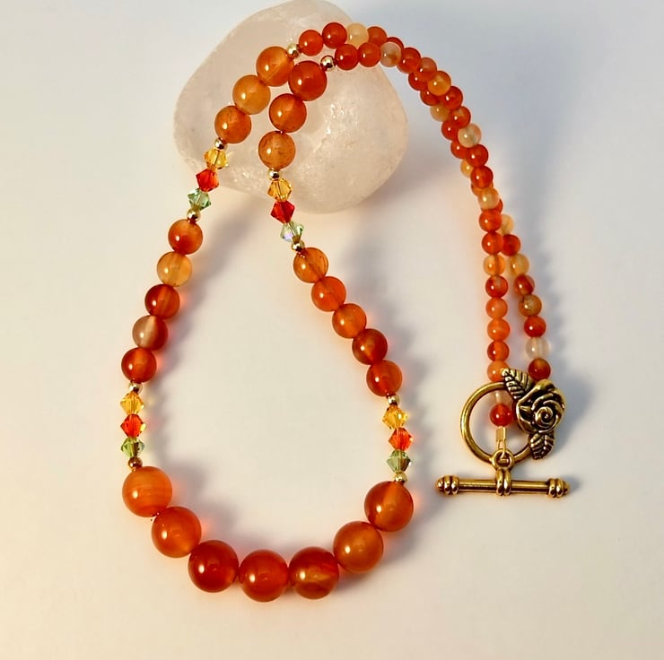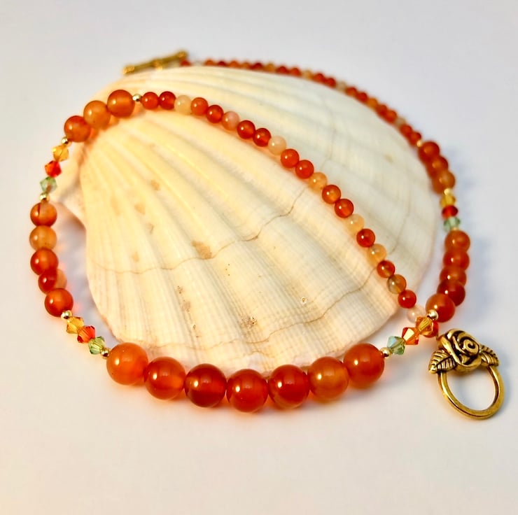 The necklace graduates to 6mm Carnelian, another trio of Swarovski crystals, then 4mm beads, culminating in a rose Tibetan toggle clasp with an antique gold finish.