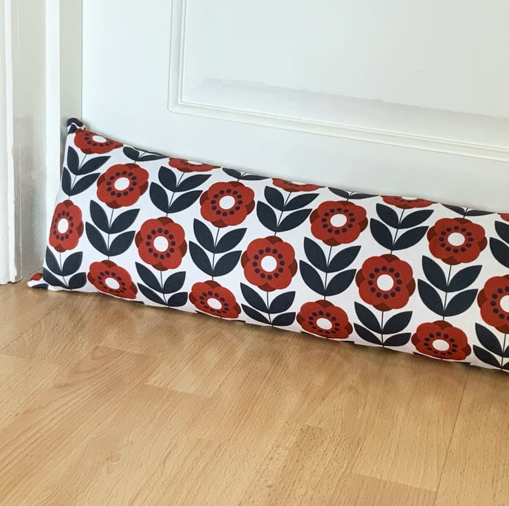 A Scandi style draught excluder in my Poppy fabric in a gorgeous dark blue and rich red.