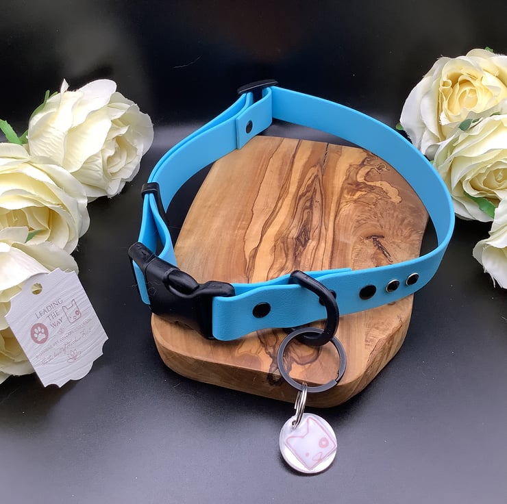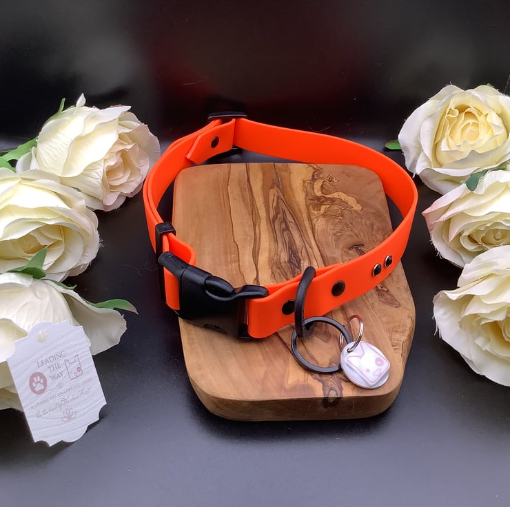 Genuine 25mm (1”) wide Beta Biothane Ajustable Dog collars. Quick release Acetal buckle for extra strength and durability. In 4 lovely colours. Sky Blue, vibrant pink, bright orange and classic gold. In 2 different sizes for medium and large dogs. All other Acetal components, keeper, Tri-glide and D-ring chosen for strength, durability and are non corrosive.