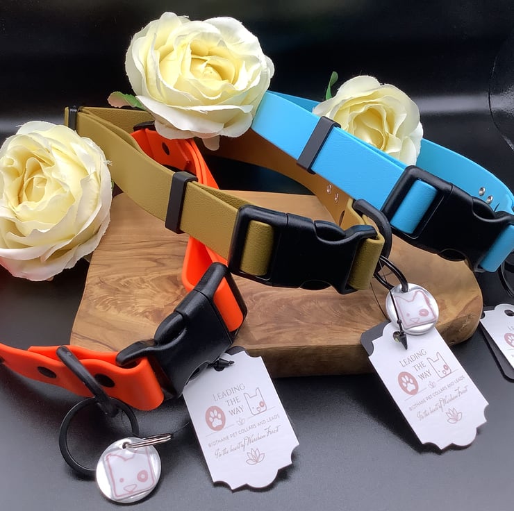 I use the Beta style of Biothane which has a likeness to leather and comes in many lovely colours and different widths accommodating most breeds of dogs.