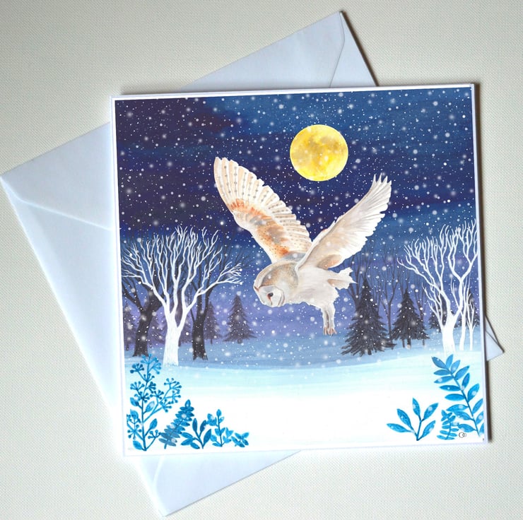 This design is one of a set of four designs I created using the theme of Winter animals, this one depicts an owl in flight in a snowy scene.