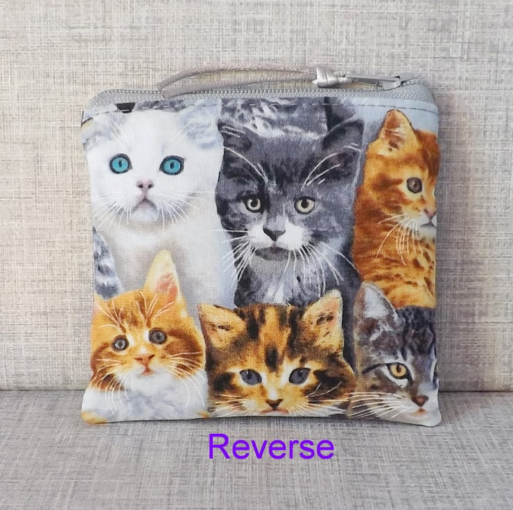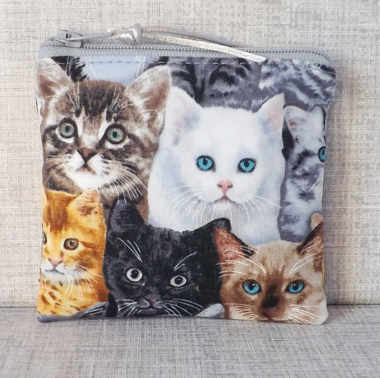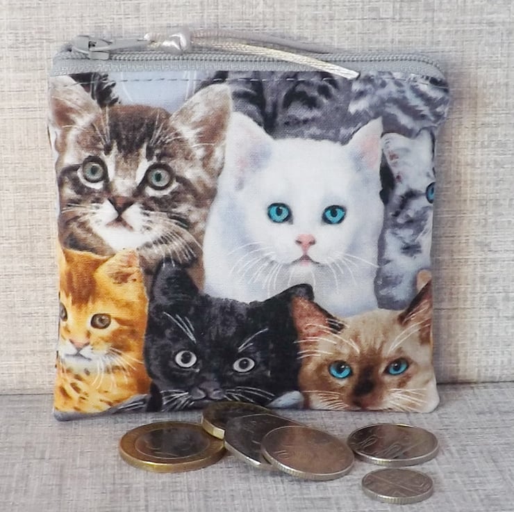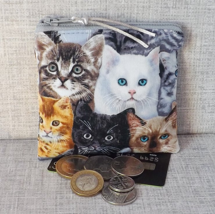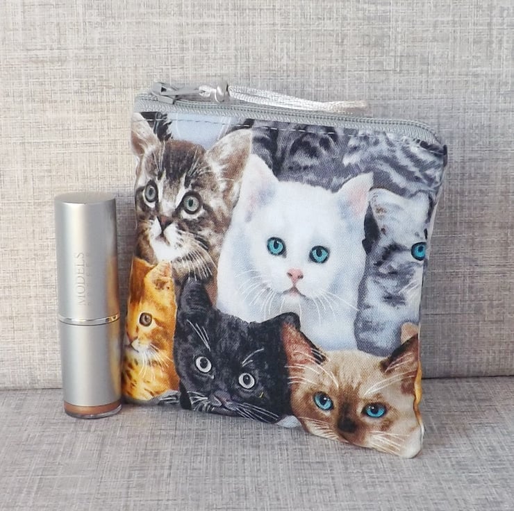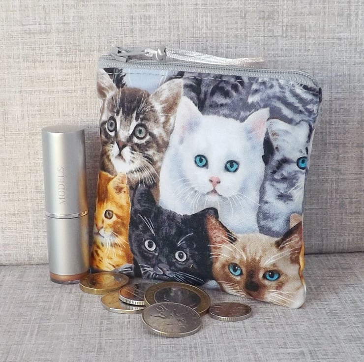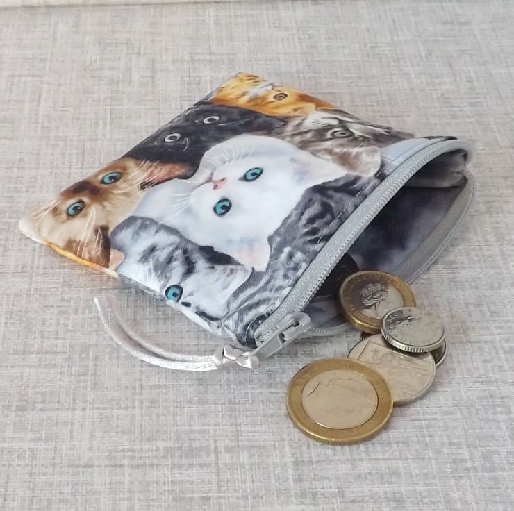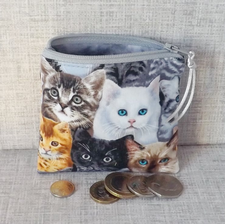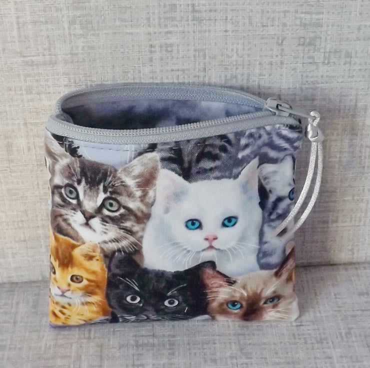 A small coin purse made from cotton fabric with a cat design, in shades of black, white, grey, gold & blue. The lining fabric is grey marbled effect cotton.