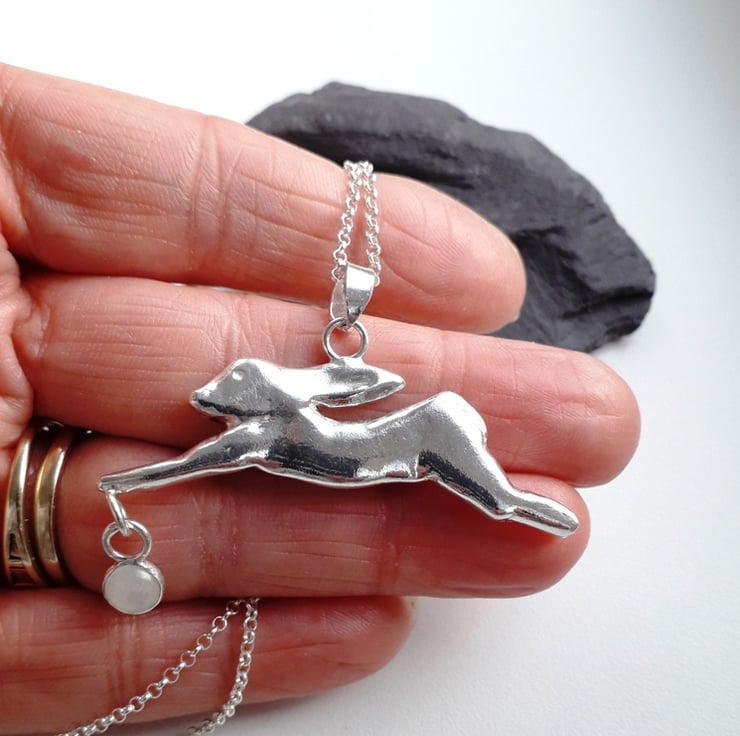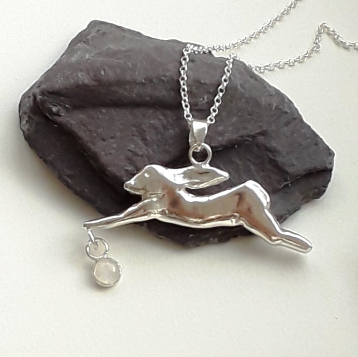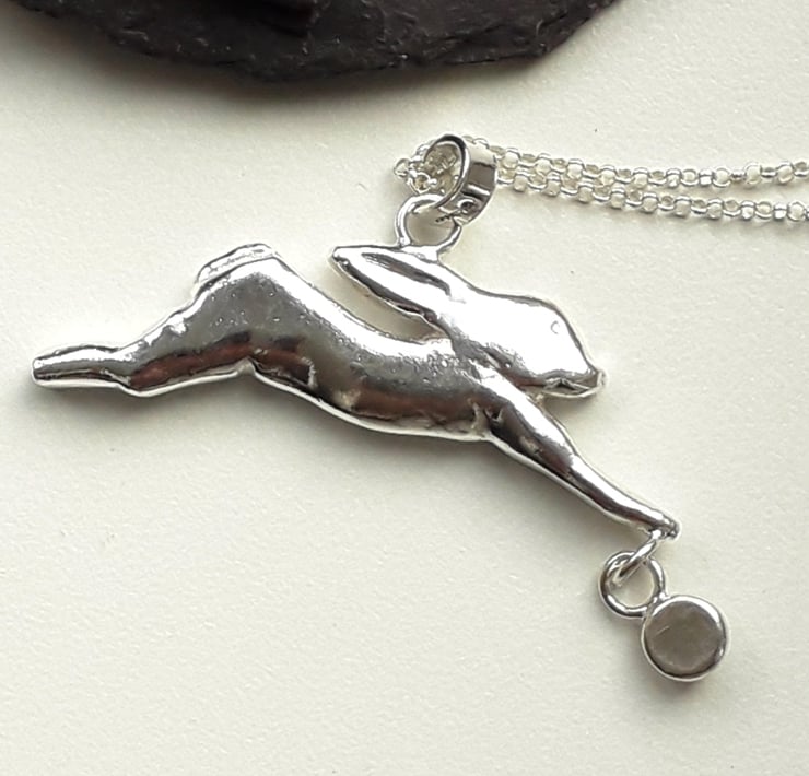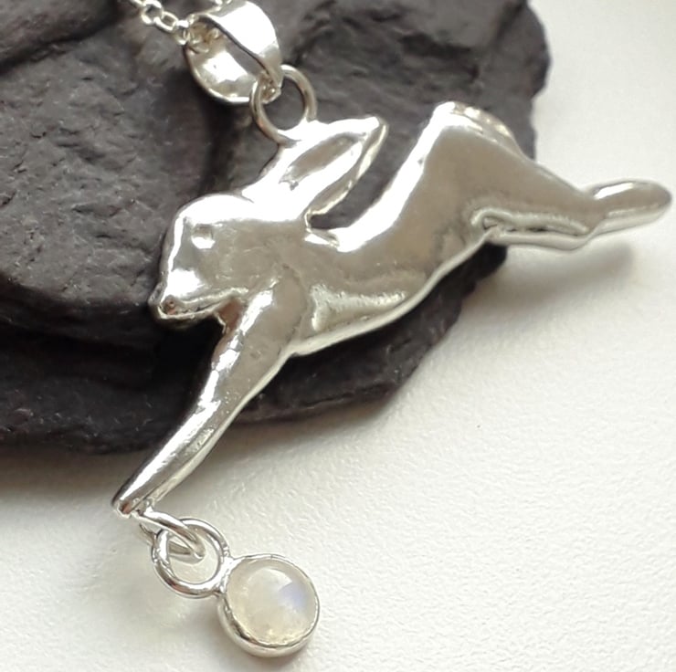 The running hare pendant is a solid 3 D design giving you a back and front view, suspended at the front paw is a 6 mm round free moving cabochon set Rainbow Moonstone.