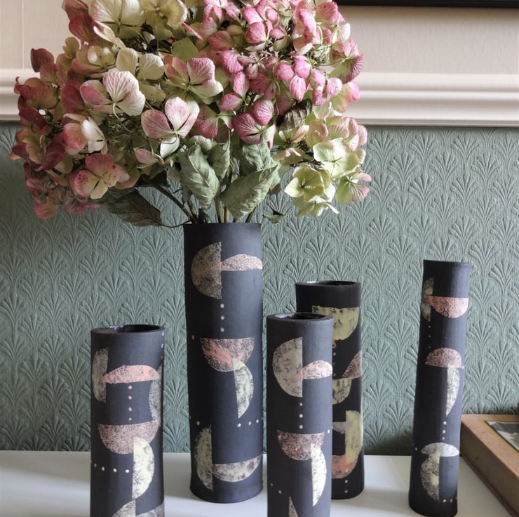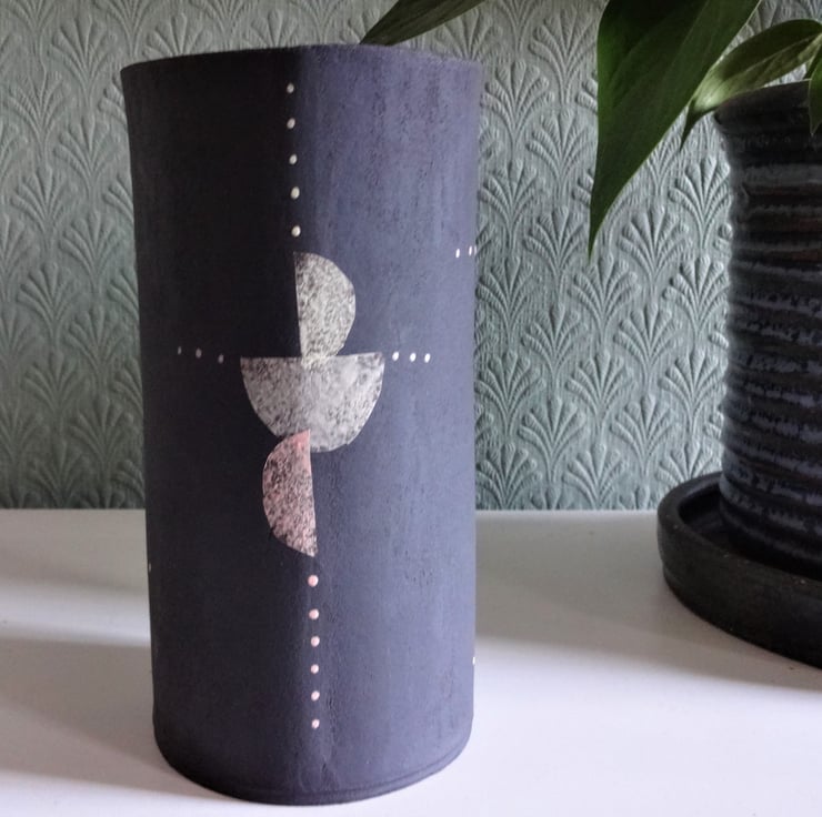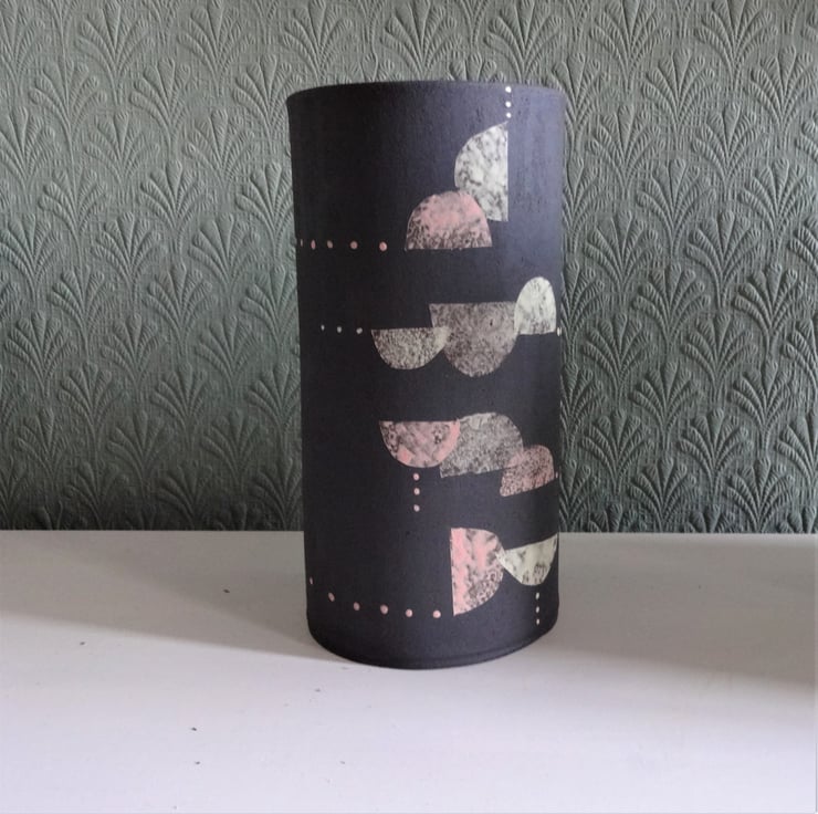This original piece of ceramic art, which makes a great gift for the home, can be used as a lovely vase for flowers or grasses, or form an eye-catching focal point just on its own. The decoration is mid-century modern inspired, my own design in soft pastel shades and half-moon shapes – from my Lunar Collection. I’ve called this piece Logan, and used black stoneware clay to create an informal cylindrical shape, glazed on the interior with a russet brownish black shiny glaze. The outside shows off the natural matt black surface of the clay, and the half-moon shapes are in soft pastel pink, lemon and grey highlighted with a series of dots. There is a different smaller version of the design on the opposite side of the oval shape. Logan is 18 cms tall and approximately 9 cms diameter at the base. Underneath you’ll find my signature potter’s mark of a swallow in flight.