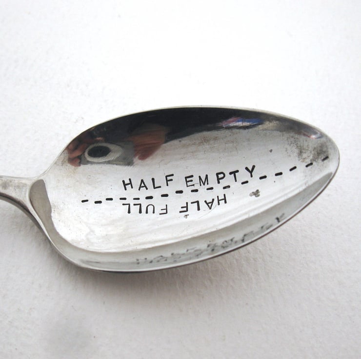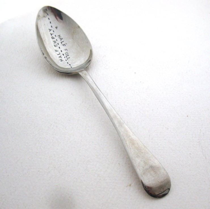A hand stamped vintage silver alloy teaspoon with a dashed line dividing the bowl in half. One half is stamped HALF FULL; turn it the other way round and the other half says HALF EMPTY. Which way up you put it is up to you!