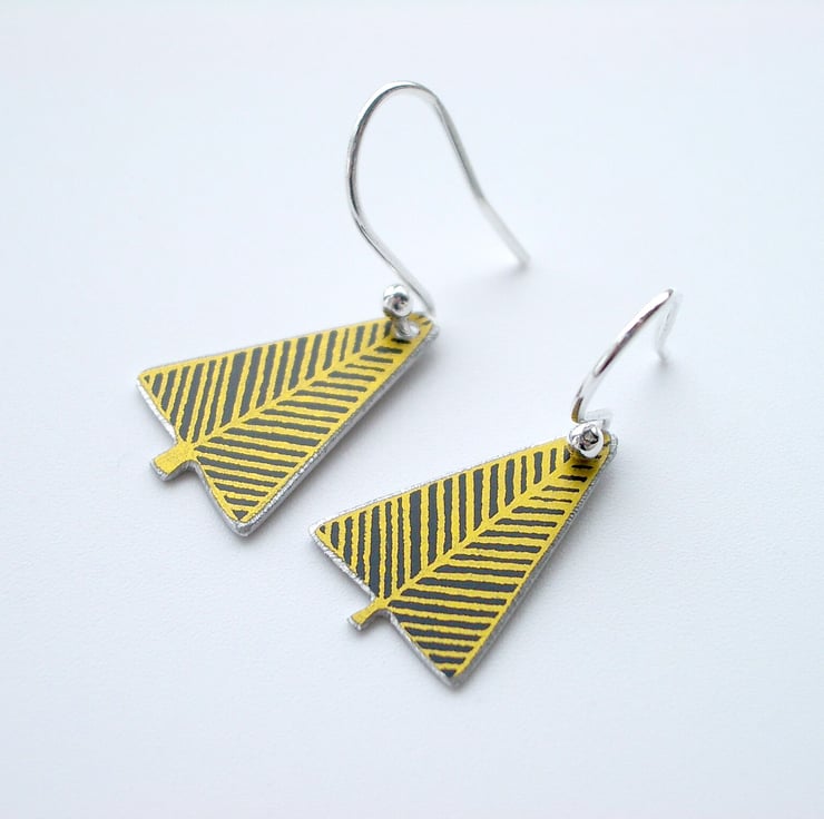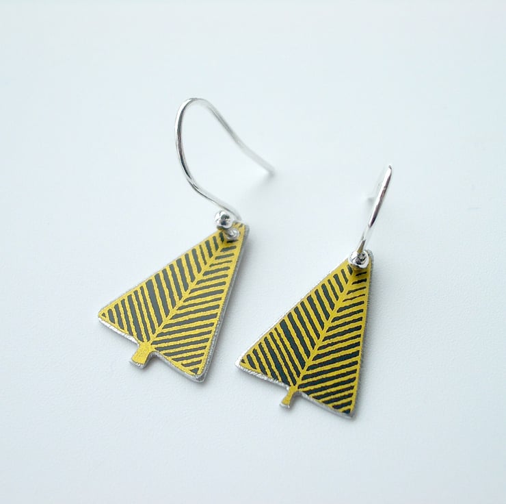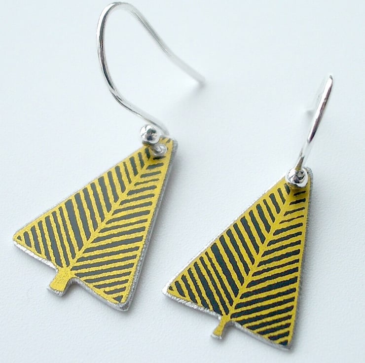 These cute scandi style Christmas tree earrings are made from aluminium which I have printed and dyed in black with gold details. I file the edges to reveal the shiny aluminium on the edges which gives a nice smooth finish.