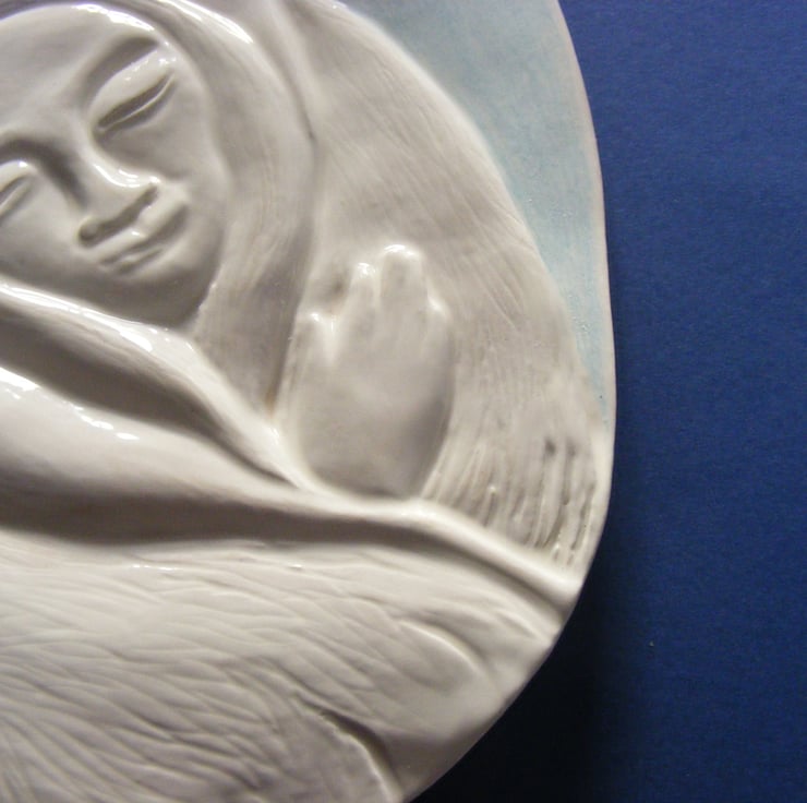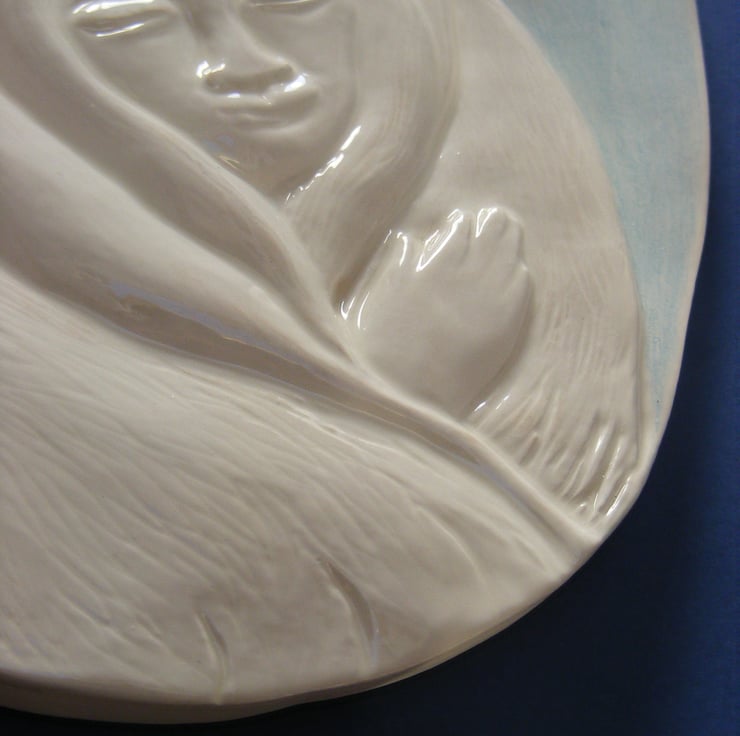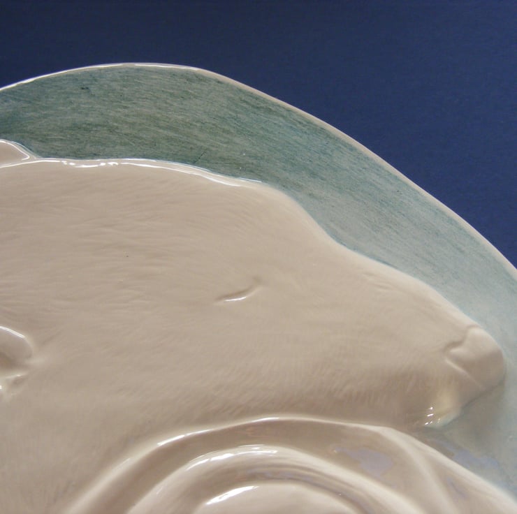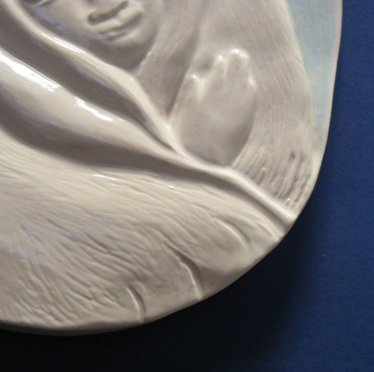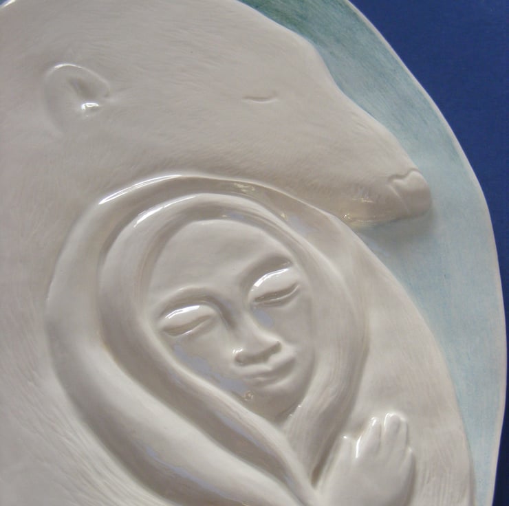 The Bear is an oval shaped carved ceramic wall hanging with a hook attached on the back. The carved image is of a white polar bear cradling protectively a figure in his arms against his chest. The figure is facing out but with their eyes closed and wears over long hair, a warm hood. The two connect as the figure slips a hand out of the warm clothing to lay it upon the arm of the bear. The Bear has beautiful fur marks indented that make the piece tactile to touch, and as you run a hand over the curved lines of the figures face and garments they also add to the sensory feel of the carving.