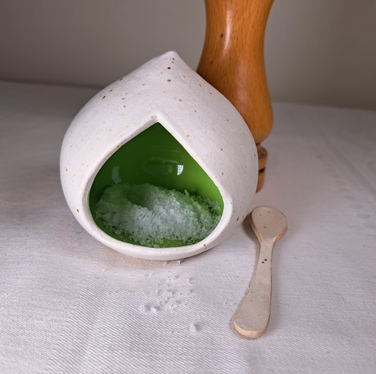 A small salt pig or cellar, with spoon, perfect for the table rather than just beside the cooker.