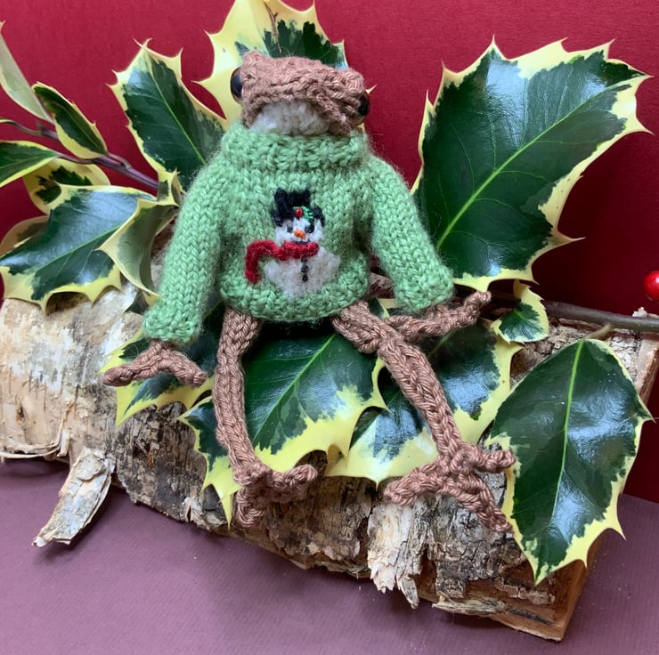 Hand knitted by me from a dot pebbles pattern, this little frog is knitted using a mix of cotton yarns and is filled with 100% sheep wool.
