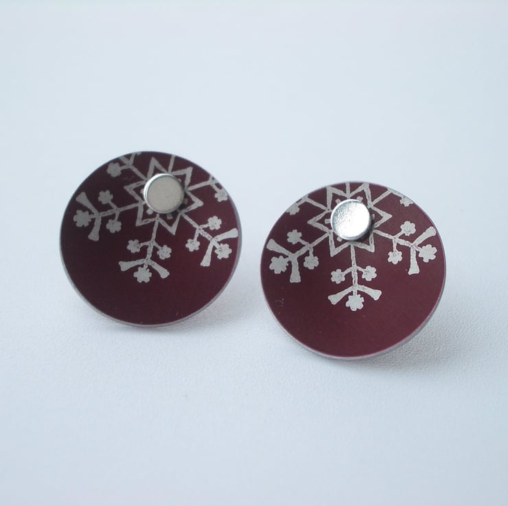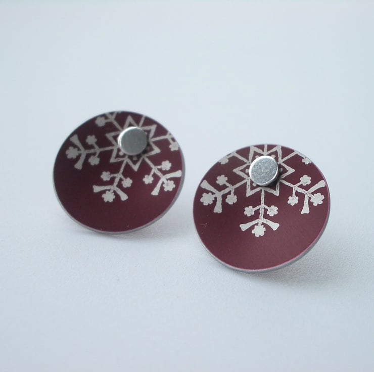 A perfect pair of earrings for Christmas or your winter wardrobe, in a crisp Scandinavian style. These sweet studs are made from aluminium which I have dyed burgundy and printed with a snowflake design. The dye is sealed in so that it is permanent and I have cut out the disc shape and filed it all by hand. I have domed the discs so that they have a subtle concave appearance. Finally, I've drilled holes for the sterling silver studs to feed through. It's not possible to solder aluminium so the studs are held onto the ear by pressure from the butterfly at the back.