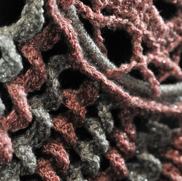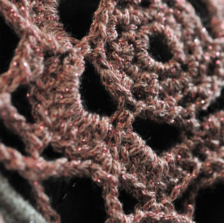 Crochet woollen dreamcatcher. Body measures approx 15cm in diameter and at its longest point approx 39 cm in length. Pink and silver with a sparkle to the wool.
