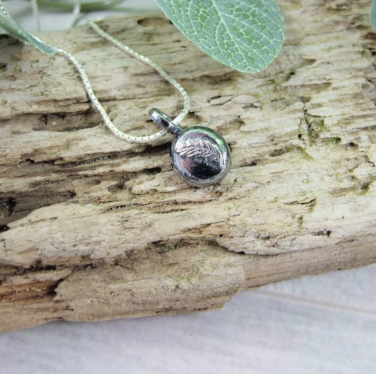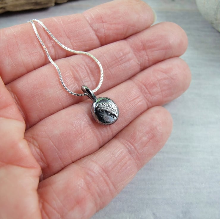 I have created the silver nugget from recycled silver heated to melting point when it forms a natural pebble shape, then slightly flattened and soldered on a smallfeather shape which I have textured by carving ith a steel tool. I have given the nugget a dark oxidised finish and polished the feather so that it stands out. Fitted to an 18 inch sterling ilver chain.