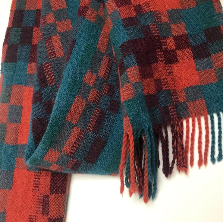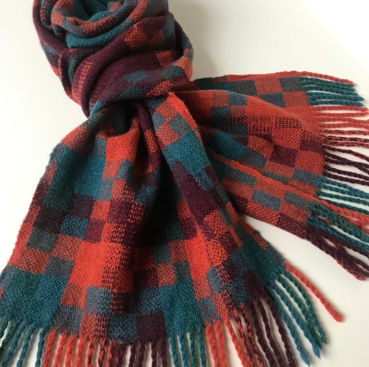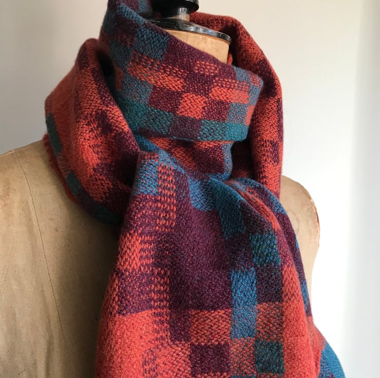 A luxuriously soft scarf designed and handwoven in my North Yorkshire studio. The unique colour combination and contemporary woven pattern create a beautiful one-of-a-kind scarf.